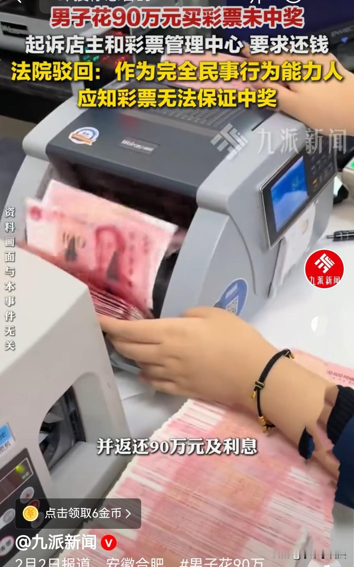 离大谱!安徽合肥,男子与彩票店老板有私信,看他每天发朋友圈谁谁中大奖了,男子看得热血沸腾,竟一个月时间里豪掷90万买彩票,结果一分没中,他崩溃!随后他以彩票店老板违法诱导、网络售彩为由将老板和彩票管理中心给告上法庭,要求必须全额退他90万。网友:就当上智商税了!有钱真好! 都说彩票是碰运气的事,小买怡情大买伤身,可何某某偏不信这个邪,短短一个月砸进去90万买彩票,结果一分钱奖都没中。 心态崩了的他非但没反思自己,反倒把彩票店老板和彩票管理中心告上了法庭,张口就要退90万,理由是被店主诱导消费、违规售彩。 本以为能讨回公道,没想到法院判决让他彻底傻眼! 张某在合肥开了家正规彩票店,手握官方代销证,平日里都是老彩民小打小闹,生意平平淡淡。 何某是店里的常客,也是张某的微信好友,平时爱买几注彩票,两人也算相熟。 谁都没料到,一向还算克制的何某,在2023年9月突然像着了魔,疯狂地买彩票。 他天天窝在家里通过微信给张某发指令,今天指定双色球号码让出票,明天要两本刮刮乐,转钱干脆利落,丝毫不拖泥带水。 张某则有求必应,收了钱就在店里正规机器出票,拍照片发给他确认,全程和到店购买无异。 起初何某每次花几千块,张某没放在心上,可看着转账金额越来越大,他心里开始不安,暗自寻思这大哥怕是上头了,这么花下去迟早要栽。 他赶紧把大额购彩风险告知书、预约通知单的二维码发给何某,苦口婆心叮嘱:何哥,你别太上头,这就是碰运气,理性点,你看下这个,把单子填了。 他本以为这番提醒能让何某冷静,没想到对方扫码填单十分利索,转头又继续转钱出票,压根没把风险提示放在眼里。 张某心里无奈,可对方执意购买,自己作为正规代销者也没理由拒绝,只能默默替他捏把汗。 短短一个月,何某的购彩金额竟累计到了90万!这可不是小数目,张某越想越担心,既怕他血本无归,也怕违反行业规定。 结局毫无悬念,彩票开奖后,90万的彩票竟一分都没中,看着满屏的未中奖截图,何某某的心态彻底崩了。 他怎么也接受不了这个结果,90万打了水漂,他非但没反思自己的贪念和冲动,反而觉得是被张某套路了,越想越气,索性将张某和彩票管理中心告上了法庭。 在他看来,张某天天在朋友圈、微信群发别人的中奖截图,就是故意诱导消费,让他觉得买彩票容易中奖。 而自己微信下单、张某微信出票,就是违规的互联网售彩,合同本就无效,理应退钱。 法庭上,何某满脸委屈,倒尽苦水,坚称自己是被张某的信息差坑了,才会一步步花掉90万。 而张某直呼冤枉,辩解自己只是按何某的要求配合出票,全程没有强迫,还反复提醒过理性投注,微信下单只是代购,票都是实体店正规机器打出,钱也进了正规账户,根本不是违规网售。 彩票管理中心也表示,已向张某颁发合法证件并定期培训,尽到了管理责任,此事与中心无关。 法官审理认为,张某的行为是线上下单、线下出票的代购模式,未脱离实体监管,并非法律禁止的互联网售彩。 彩票站老板朋友圈发布他人中奖截图是客观事实,并非针对性诱导。 而何某作为完全民事行为能力人,理应知晓彩票风险。更关键的是,张某已尽到风险提示义务,何某自愿填写告知书、执意大额投注,理应自行承担后果。 法官还强调,彩票买卖合同属于射幸合同,中奖与否全凭运气,购彩者自愿购买,就该接受未中奖的结果,不能以此主张合同无效。 最后法院判决:驳回何某的全部诉讼请求。 有人说,愿赌服输!还是赌徒心理太贪婪,不能中了就领奖,不中就告状啊!买彩票就是赌博,哪能那么容易中奖呢! 有人说,这下心理平衡了,人家90万都一分没中! 还有人说,有这90万买套房子不香吗?唉,真无语! 彩票店老板张某虽赢了官司,却也心有余悸,经此一事,怕是再遇到这样的“豪客”,准会再三劝退,怕再惹一身不必要的麻烦了! 而何某抱着一夜暴富的心态买彩票,到头来落得竹篮打水一场空,又想要回90万,不知他咋想的,什么奇葩都有!还是长点心吧! 对此您怎么看?