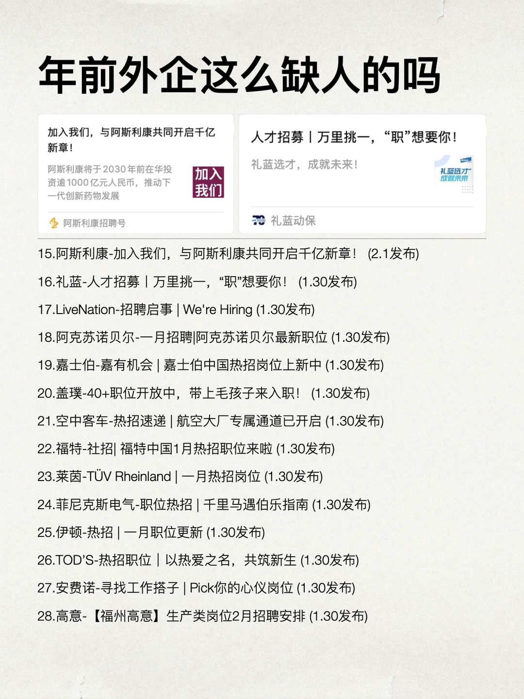 没想要临近要放假了,外企放的岗位还越来越多了,看图上就知道,两天内官方发布的就有10多家,挺意外的 不过年前没事的,确实可以去冲冲,这段时间放的岗位真实性反而高、流程反而快,而且竞争真的没有年后那么大 外企相对来说更好实现wlb,基本上都是 955、双休、年假 10–15 天起。如果是对这方面有要求的,也可以去试试 坚持日更✊🏻,对外企感兴趣的欢迎常来看看