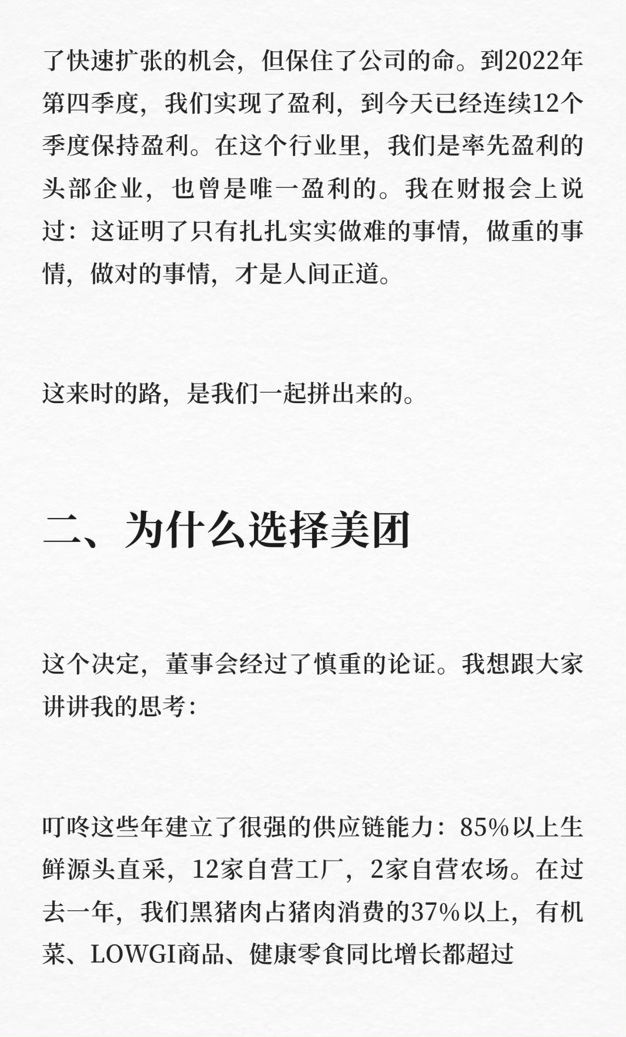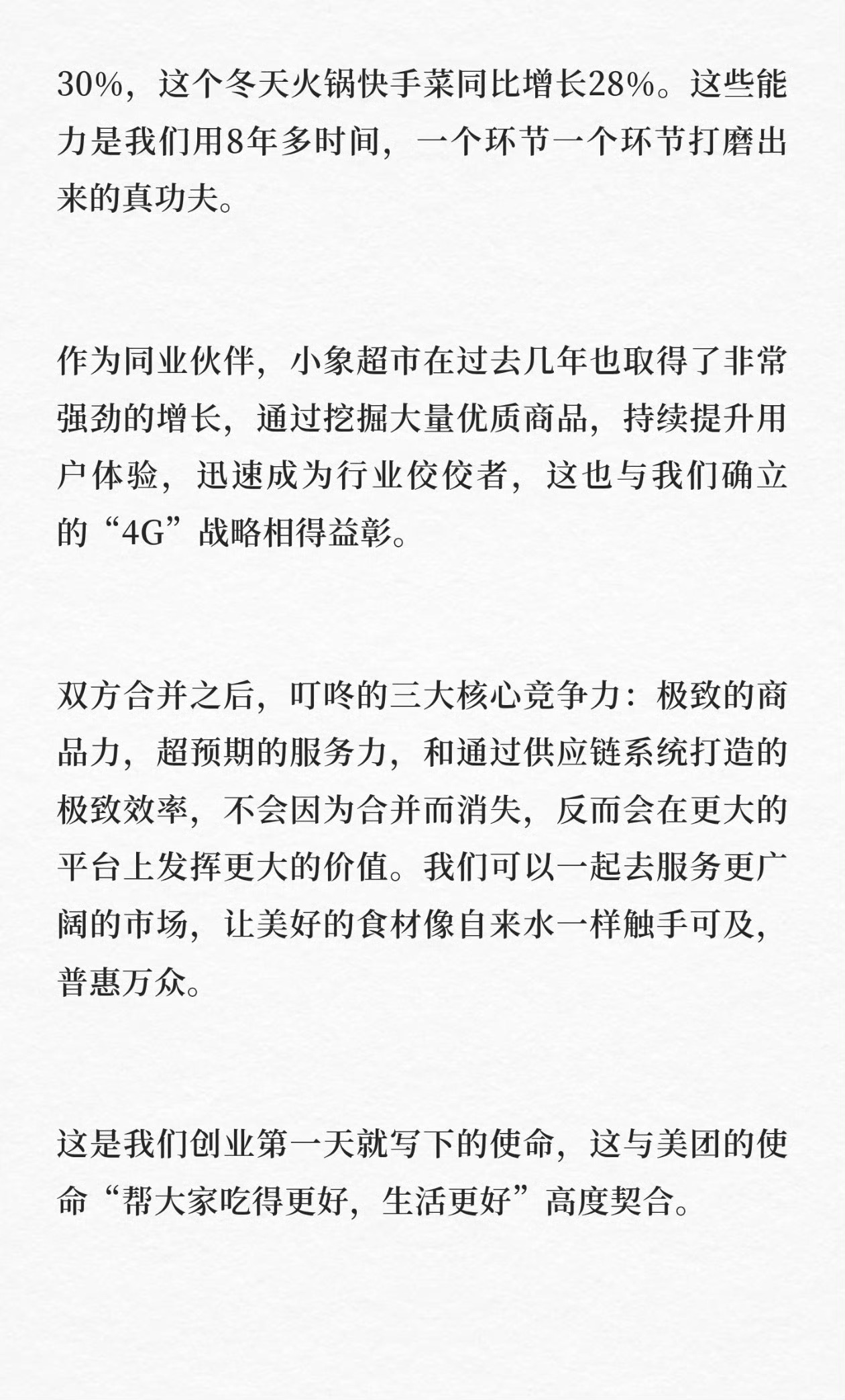 美团收购叮咚买菜。叮咚买菜CEO梁昌霖发的全员信,这是一个幸福的决定,放下相向的较量,转为并肩的同航,与优秀的人同行,继续做难而正确的事!