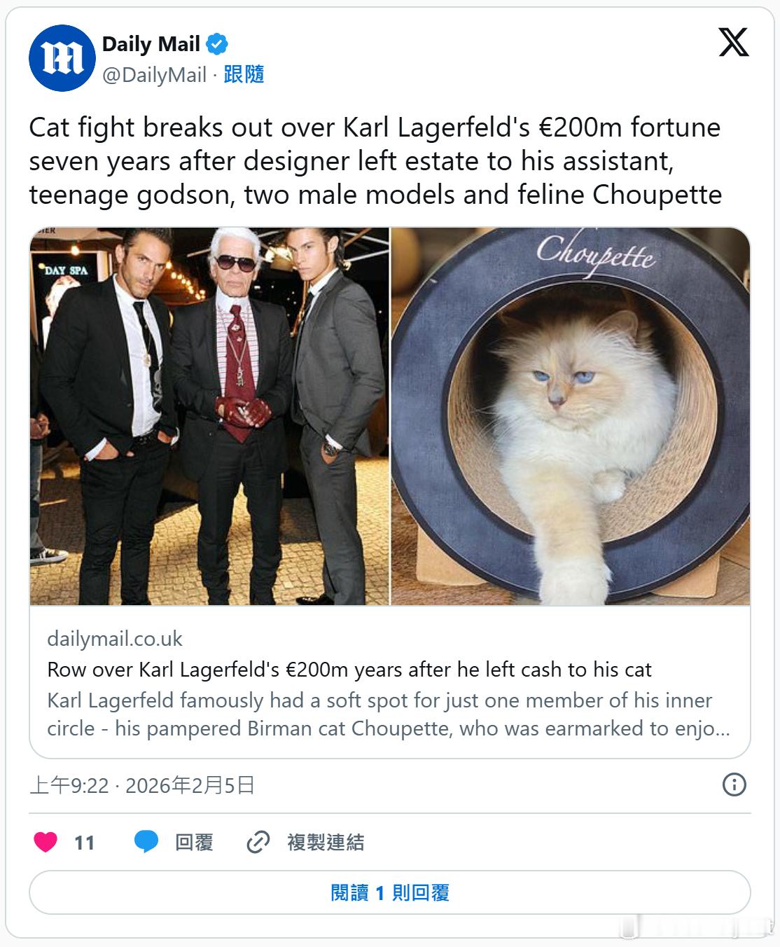 上亿遗产或引争夺?时尚“老佛爷”遗嘱留给爱猫,神秘人士现身提出异议海外新鲜事 综