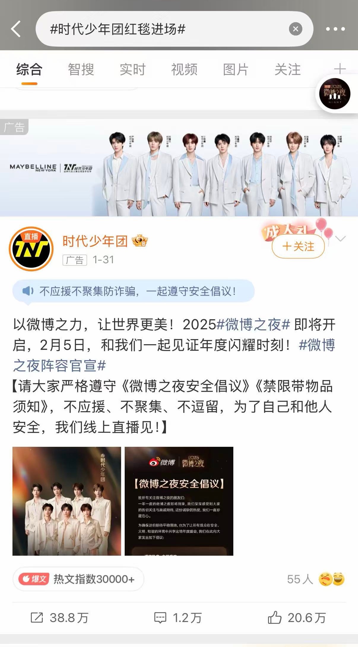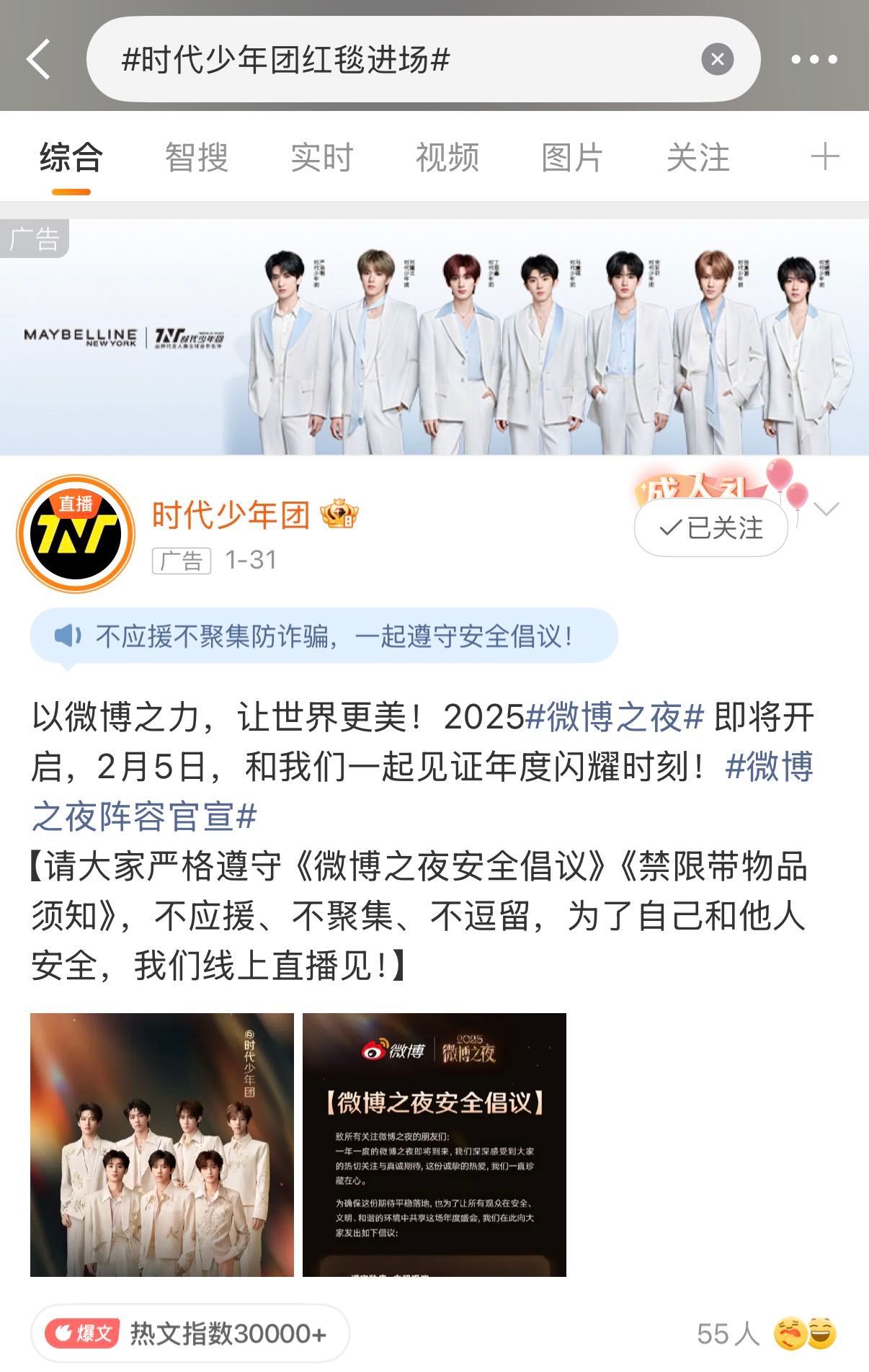 时代少年团红毯妆造 今晚微博之夜时代少年团每个热搜点进去都能看到美宝莲广告图的身