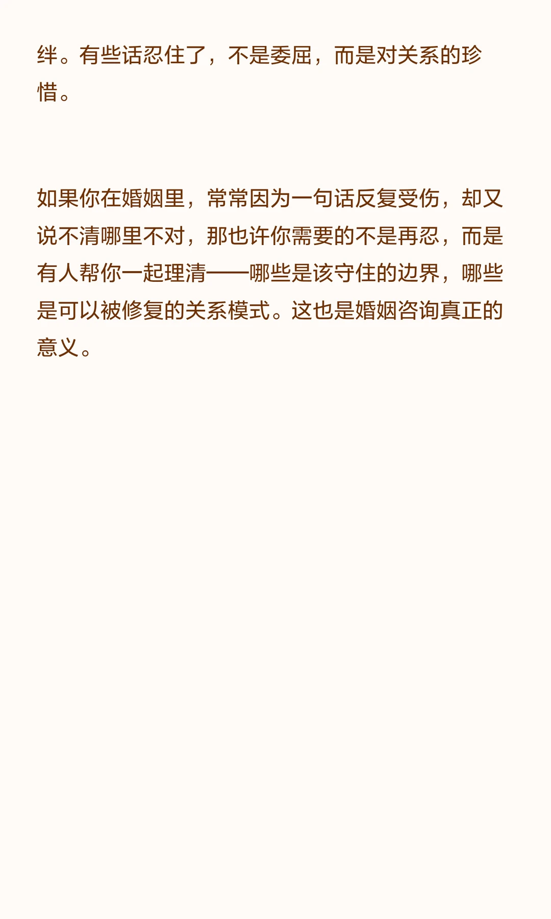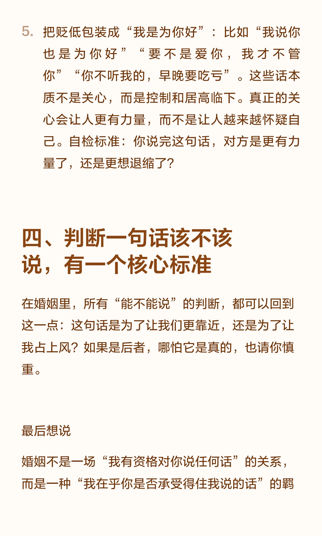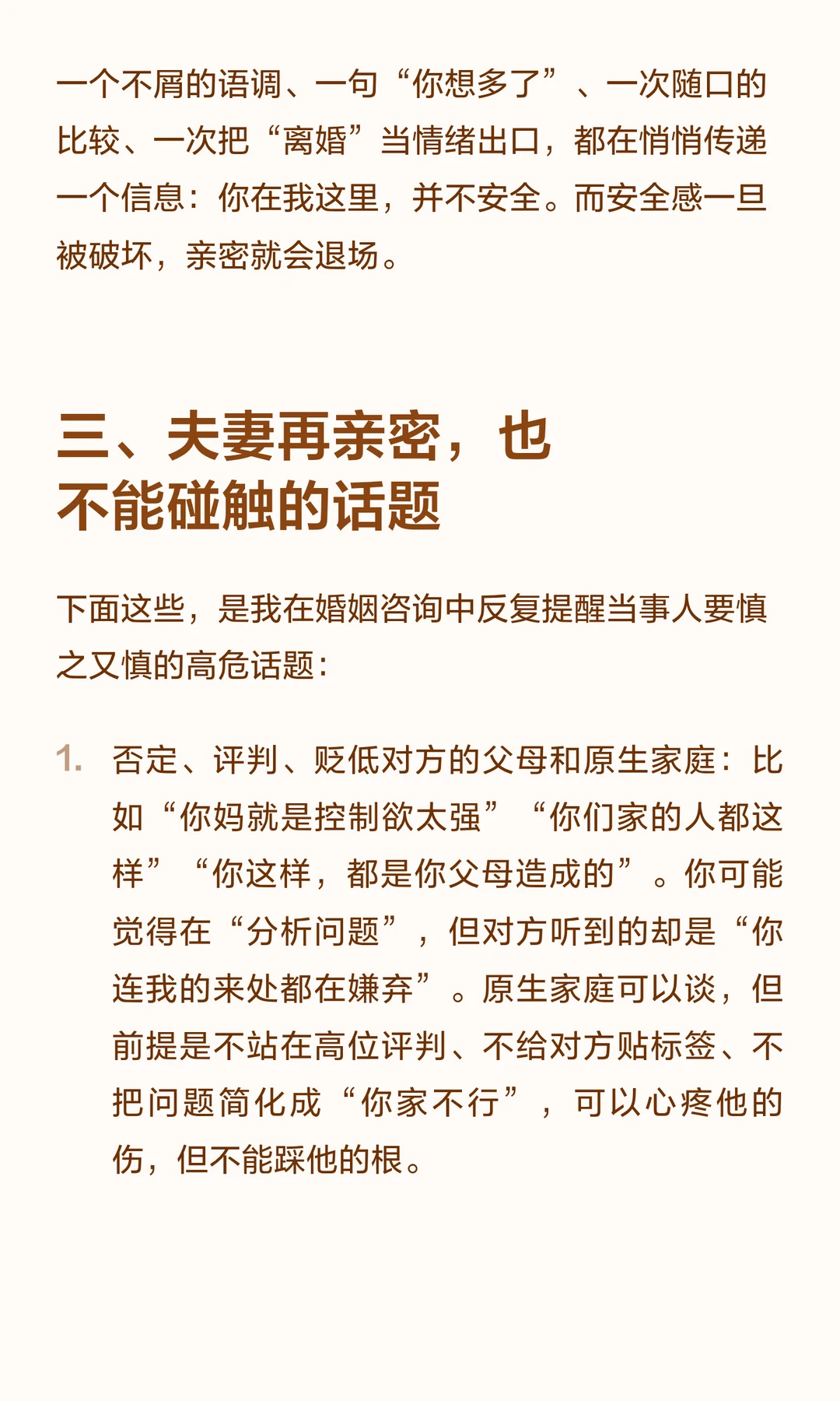 婚姻中的坦诚并非无话不谈,而是懂得什么该说、什么要守住。边界保护关系,而非疏远。避免否定、评判、贬低对方,过度谈论前任,随意把“离婚”当情绪武器。真正成熟的做法是冷静后再谈问题和底线。
