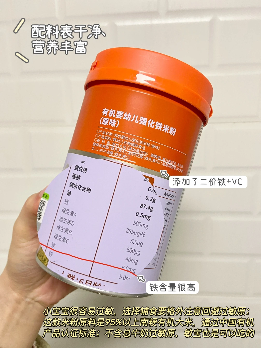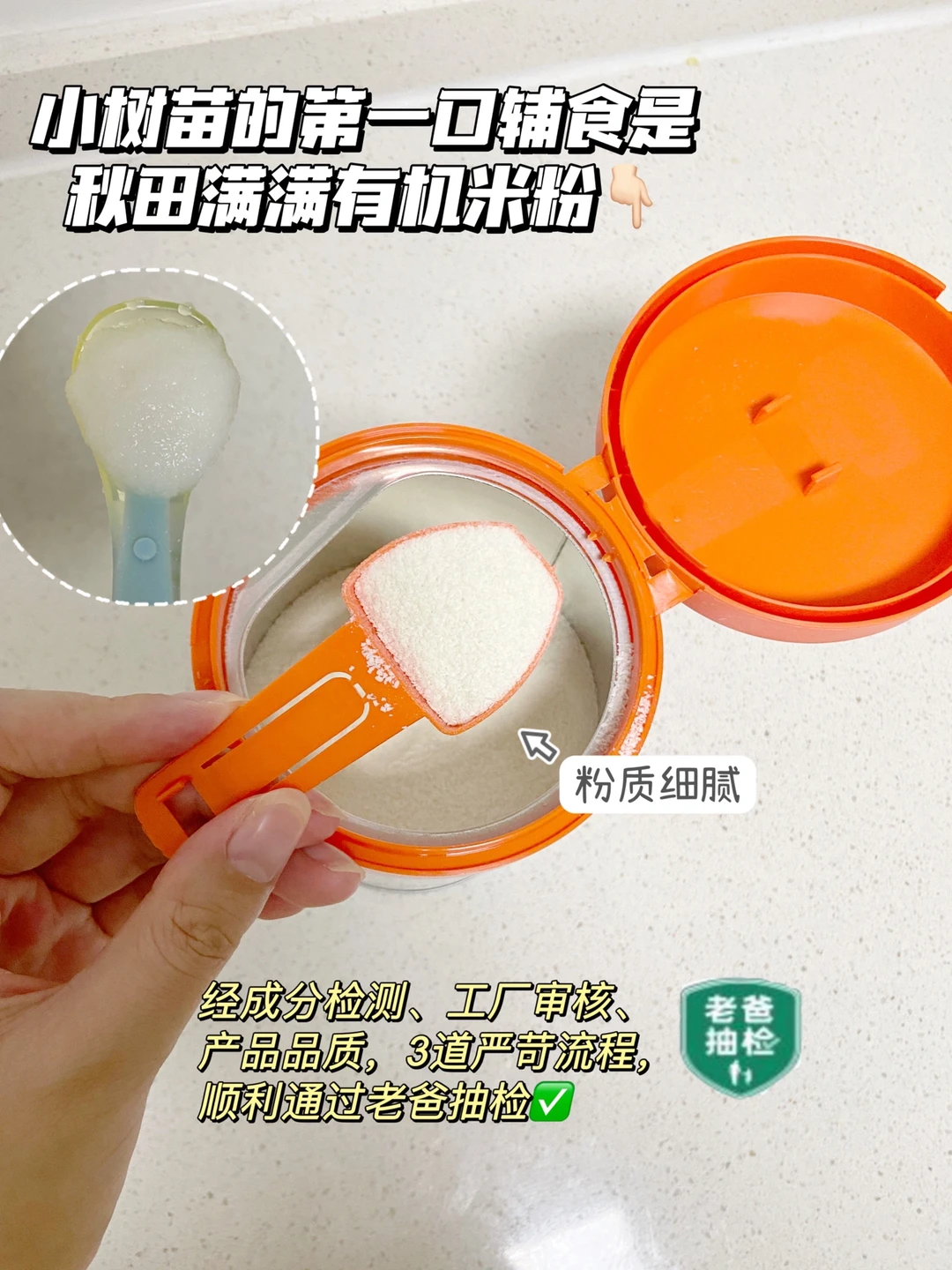 🌟🌟小树苗的第☝️口米粉是从高铁米粉开始的,当时我们吃秋田满满有机米粉,是闺蜜家的小孩吃的这个觉得很好分享给我的。我看了配料表和营养表也很满意,就给小树苗安排了,原料是95%以上南粳有机大米,通过了中国有机产品认证标准,不用担心化肥农药这些有害物质。铁含量很高,还特别添加了二价铁以及维生素C,营养方面也是很丰富。选择它还有一个原因:孕期就关注“老爸抽检”,知道他们很严苛,这款米粉就是通过了老爸抽检的。