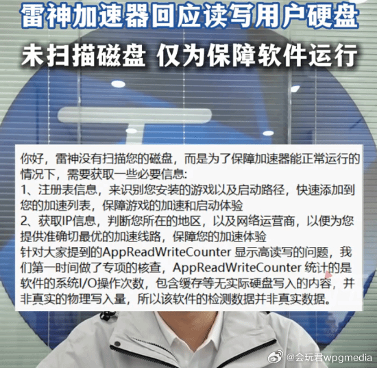 雷神加速器被指异常读取用户硬盘,官方回应来了近日,多位用户反映,在使用雷神加速器过程中发现软件有异常高的读取与写入硬盘数据。其中一位用户的视频画面显示,雷神加速器最大读取速度为301MB/秒,最大写入速度为43MB/秒。2月4日,雷神加速器客服告诉《正在新闻》,雷神加速器并没有扫描磁盘,而是为了保障加速器能正常运行的情况下,需要获取一些必要信息,以获得更好的体验。针对用户反应的异常高读写数据的问题,客服表示,经核查为用户使用监测软件问题,用户使用的监测软件包含缓存等无实际硬盘写入的内容,并非真实的物理写入量,并非真实数据。