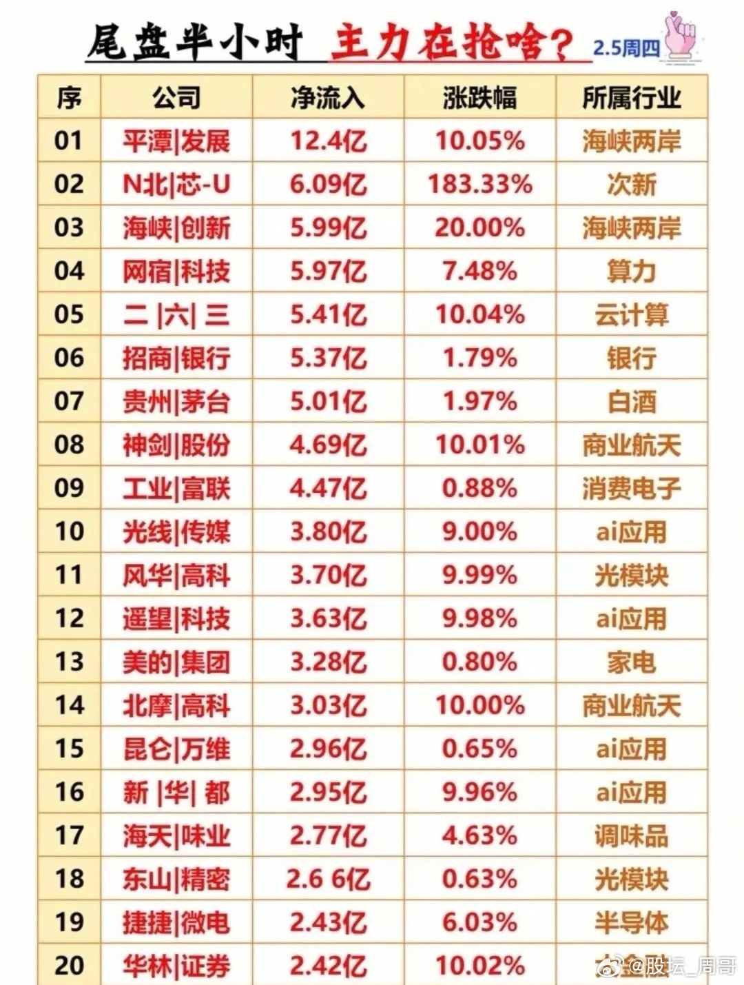 主力资金动向:平潭发展、海峡创新领衔海峡两岸板块吸金超19亿,算力、云计算、商业航天同步获资金重点布局,银行、白酒等权重标的也获增持。尾盘半小时资金突袭!