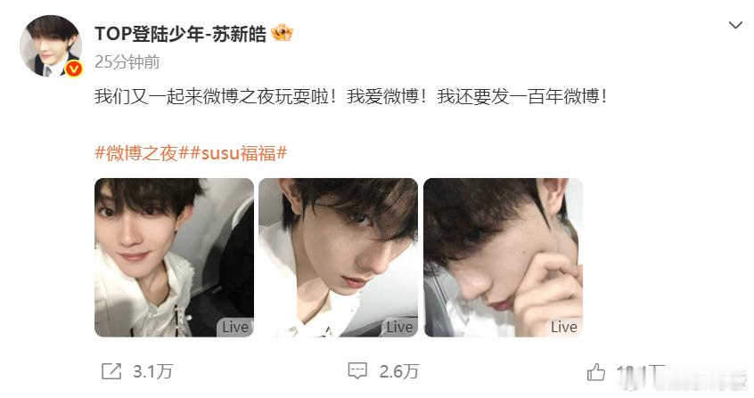 苏新皓 我还要发一百年微博 晒微博之夜后台自拍live,“我爱微博!我还要发一百