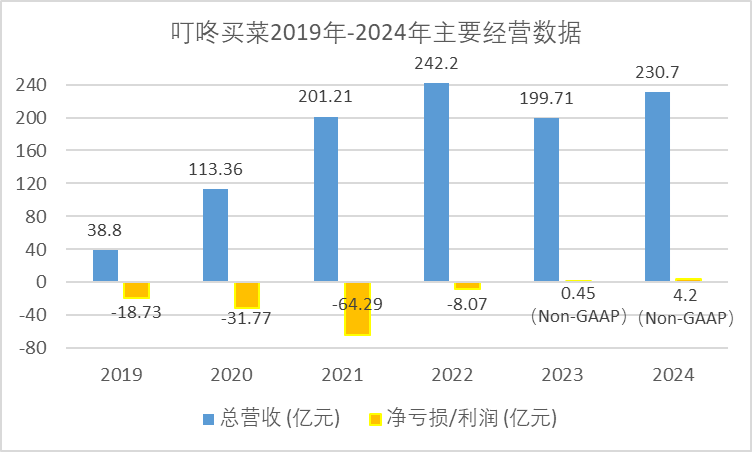 从基本面观察,在生鲜电商行业打斗的前5年,叮咚买菜表现出来的是营收成倍增长,但净亏损持续扩大。直到2022年第四季度,才首次实现单季盈利,Non-GAAP(非公认会计准则)净利润1.16亿元,此后两年均实现年度盈利并不断扩大。