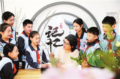 在天津港保税区空港实验小学,有一堂特殊而专业的美育课——“非遗传统插花技艺”。课程不仅讲授插花的审美、方法与技巧,更深入融汇插花历史、礼仪等文化内涵。孩子们学习到,插花最早以原始花束、胸花、头花等形式出现于春秋战国时期,用于馈赠、祭祀等场合,《楚辞·九歌·山鬼》《诗经·郑风·溱洧》等古籍中均有相关记载。插花艺术在汉代步入初始阶段,隋唐时期日趋兴盛并传入日本,至宋代达到鼎盛——这些历史脉络,学生们都能娓娓道来。