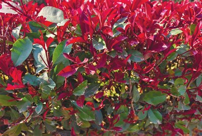 我在城里乡下都见过红叶石楠,却没见过其开花。只见过她把新芽高高举,簇簇举,举满头顶,在头顶处,长出红如火的叶片来,那叶也就如花盛开。红叶石楠红叶甚多,不经剪裁,自成圆冠,圆冠之下,绿得浓浓密密,圆冠之上,红得星星点火,越是太阳照,红得越是鲜而艳,夺目而耀眼,排排团团簇拥一起,把天把地都烧得红彤彤的。成片成块的红叶石楠,万绿丛中跳跃着万千火苗,衬得周围整块天地都是一层红晕,那景色壮丽惊人。