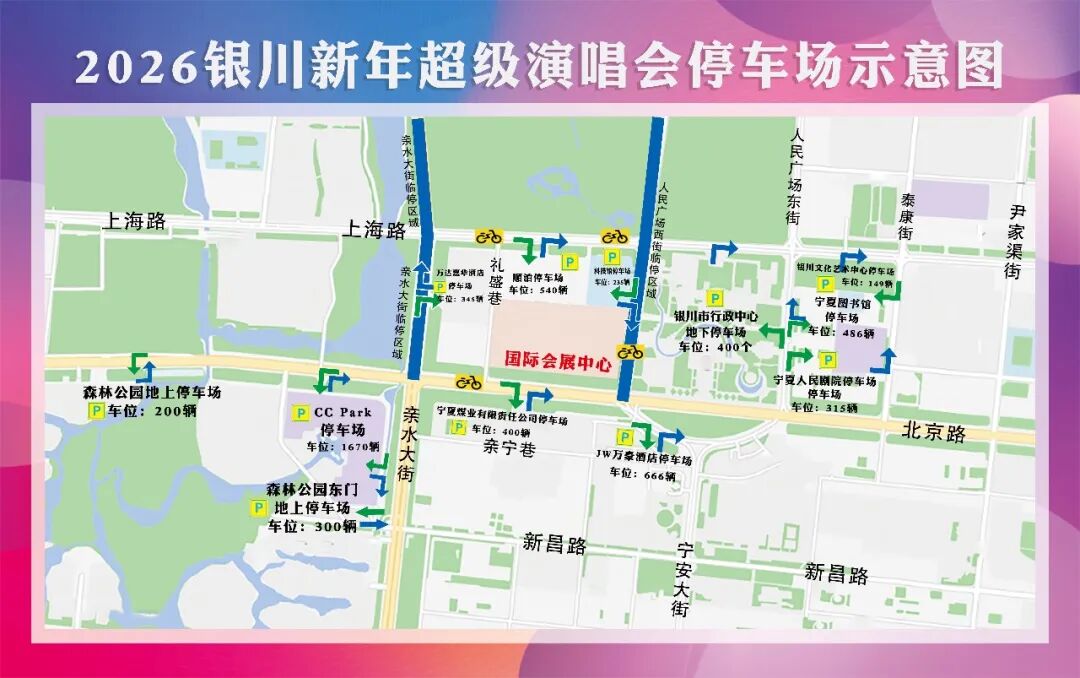 为方便观演群众有序停车,演唱会期间可使用手机“扫一扫”停车二维码,实时了解银川国际会展中心周边停车场停车地点和停车泊位相关情况,精准导航、提前规划、择路通行。