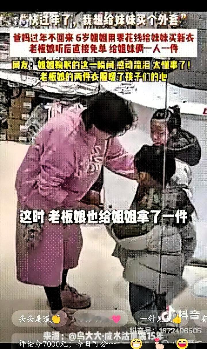 “活该发财!”天津,一童装店内进来了一对姐妹,姐姐冻得脸蛋通红,手里紧紧攥着二十多块零钱,怯生生地说想给妹妹买件棉衣。 老板娘看到孩子冻得发紫的小手,没有丝毫犹豫,立刻从里屋抱出一堆厚实的棉衣,蹲下来让孩子慢慢挑选,还贴心地说先试合身,钱的事不用急。 她细心地给妹妹穿上一件带绒的粉色棉衣,又往姐姐手里塞了两双棉袜,说这是额外送的。得知孩子只有这点钱,老板娘直接免了单,说就当是给孩子的新年礼物。临走时,她还不忘往姐妹俩兜里塞了两块热红薯,让孩子路上暖暖身子。 姐姐被这份突如其来的善意打动,当场鞠躬致谢,眼泪在眼眶里打转。这一幕没有华丽的辞藻,却格外戳心。 小本生意本就不易,每一分钱都来之不易,但老板娘却选择把温暖留给需要的人。她的善良,不是刻意作秀,而是发自内心的共情与体谅,既帮孩子解决了寒冷,又悄悄维护了孩子的自尊。 真正的善意,从来都不是惊天动地的壮举,而是在别人最需要的时候,递上一份恰到好处的温暖。这样有温度、有良心的店主,生意红火是必然的,因为人心换人心,善良终有回响。