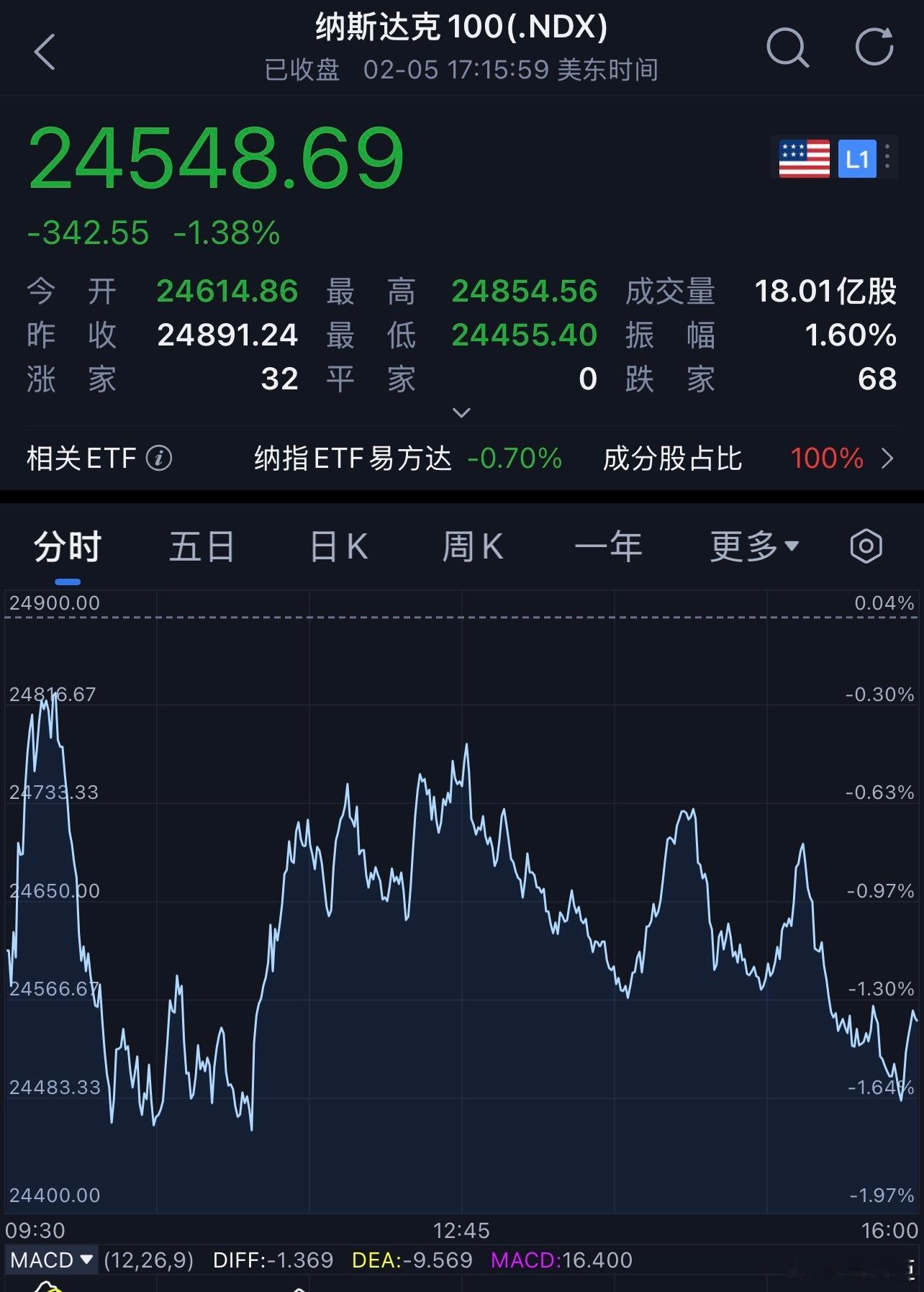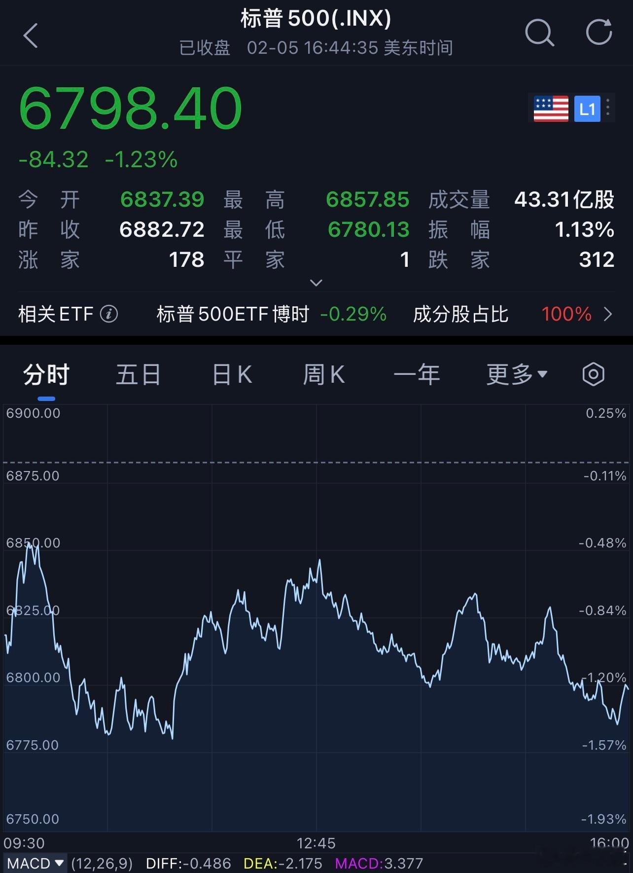 昨夜美股继续回落,截至收盘,标普500指数跌1.23%,报6798.4点;纳斯达克综合指数跌1.59%,报22540.59点,也是自去年4月以来最严重的三日抛售;道琼斯工业平均指数跌1.2%,报48908.72点。