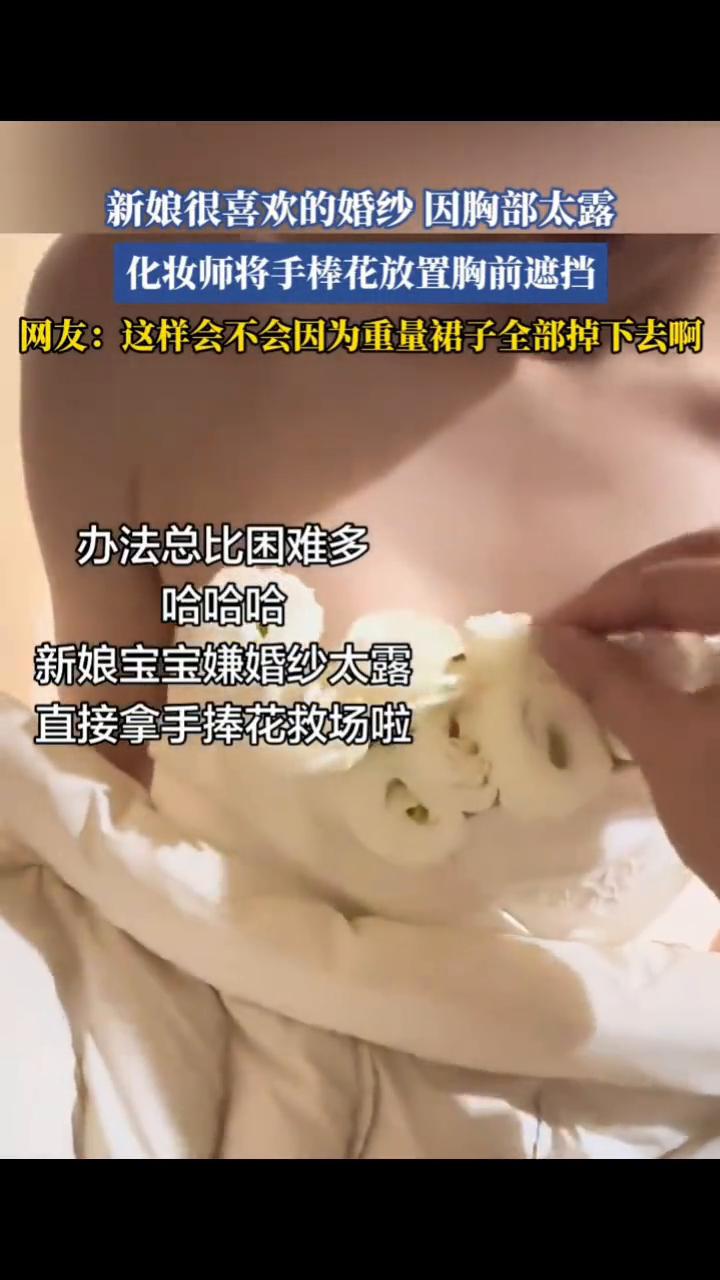 新娘很喜欢的婚纱因胸部太露,化妆师将手捧花放置胸前遮挡。 网友:这样会不会因为重量裙子全部掉下去?办法总比困难多。 新娘宝宝嫌婚纱太露,直接拿手捧花救场。因为新娘宝宝很喜欢这个婚纱,可是她太瘦了,后腰可以收,但是胸前还是有点露,新娘宝宝老是往下看,有顾虑,状态不是很好,所以就想到了这个方法,更自信、更美。结婚时候贴了一天胸贴,直接过敏,疤痕一年才好。