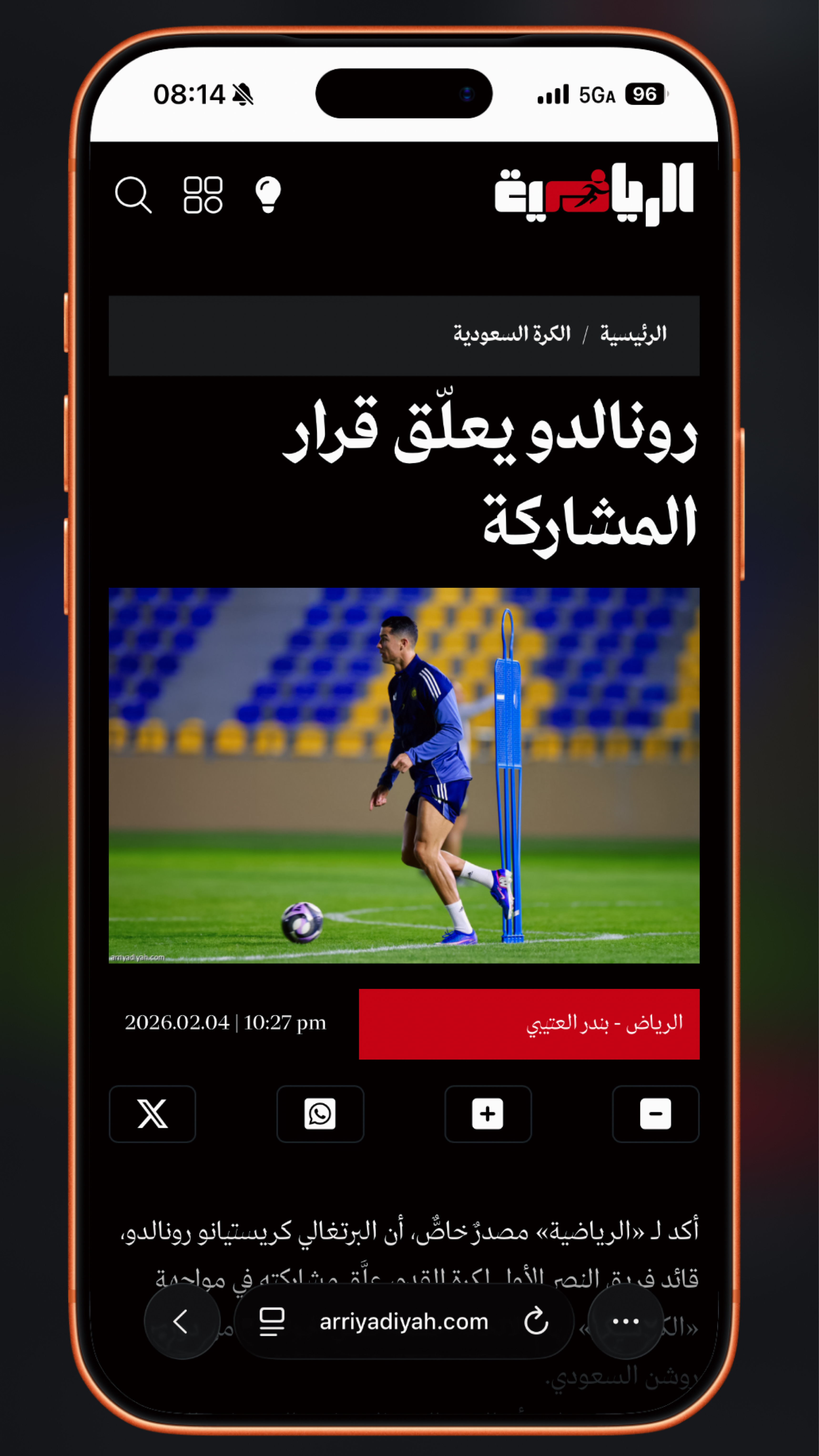 🌟 与此同时,据“利雅得体育报”周三援引消息人士报道,利雅得胜利队队长克里斯蒂亚诺·罗纳尔多已宣布暂停参加与伊蒂哈德队的“国家德比”。同一消息来源称,这位葡萄牙球星与法国球员金斯利·科曼一同参加了训练,但“C罗”尚未告知由其同胞豪尔赫·热苏斯领衔的教练组他是否决定出战。