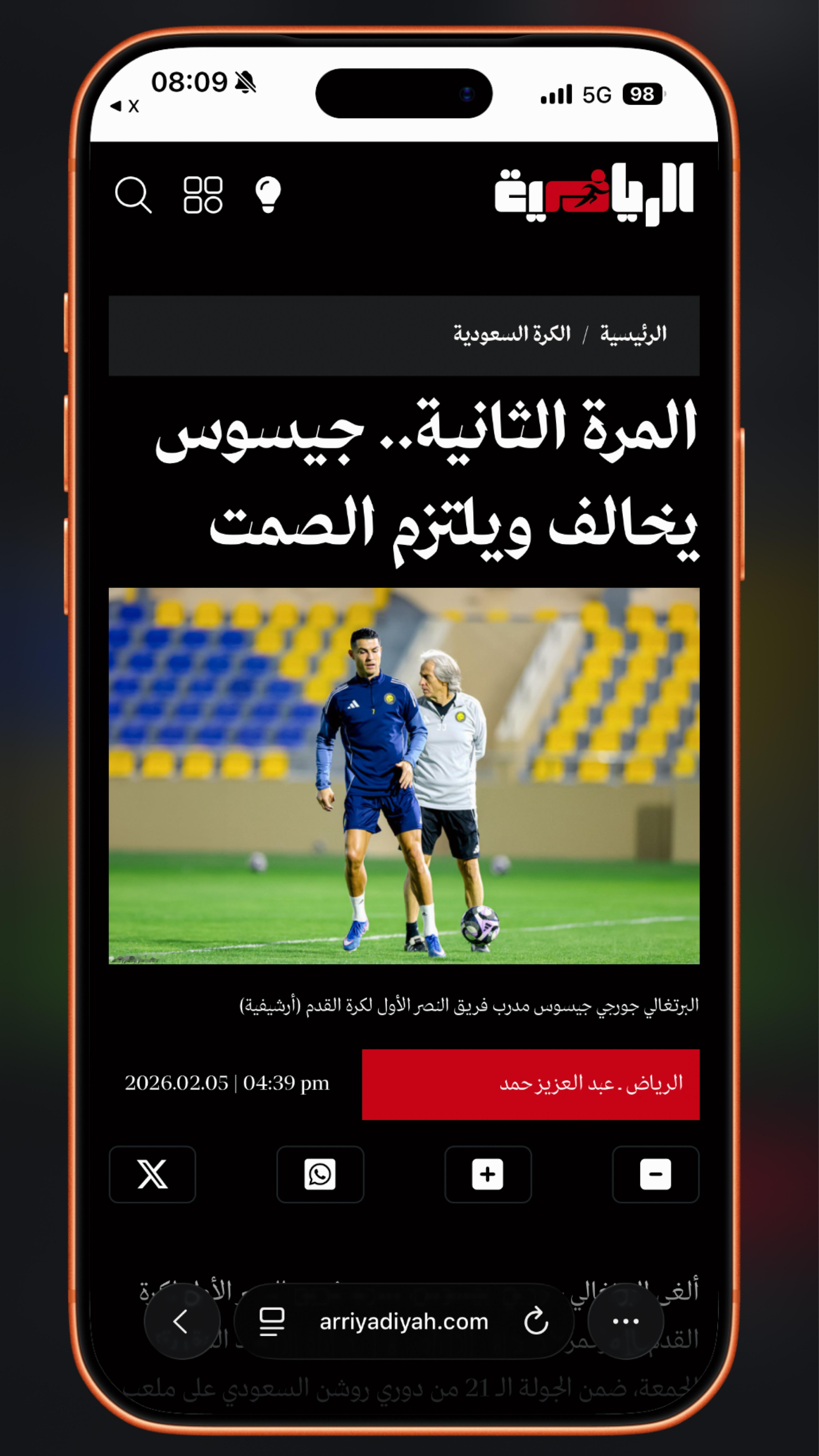 🔶 2月5日报道:据“利雅得体育报”一位消息人士透露,利雅得胜利队葡萄牙籍主教练豪尔赫·热苏斯取消了原定于周五在利雅得阿瓦尔公园体育场举行的沙特职业联赛第21轮对阵吉达联合队的赛前新闻发布会。