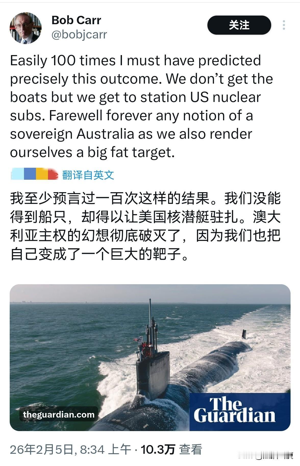 在美国不演了,澳大利亚就是他们的工具人。 - 不交付给澳大利亚已付款订单上的核潜艇 - 派驻美国核潜艇到澳大利亚 - 潜艇们依然在美国的指挥下 这样他们就有了订单上的核潜艇,不算违约,核潜艇还继续自己的控制下。 现在澳大利亚那边的大人物们全在马后炮,悔不当初:【梦想破灭,澳大利亚软骨头,钱花了主权也丢了】。