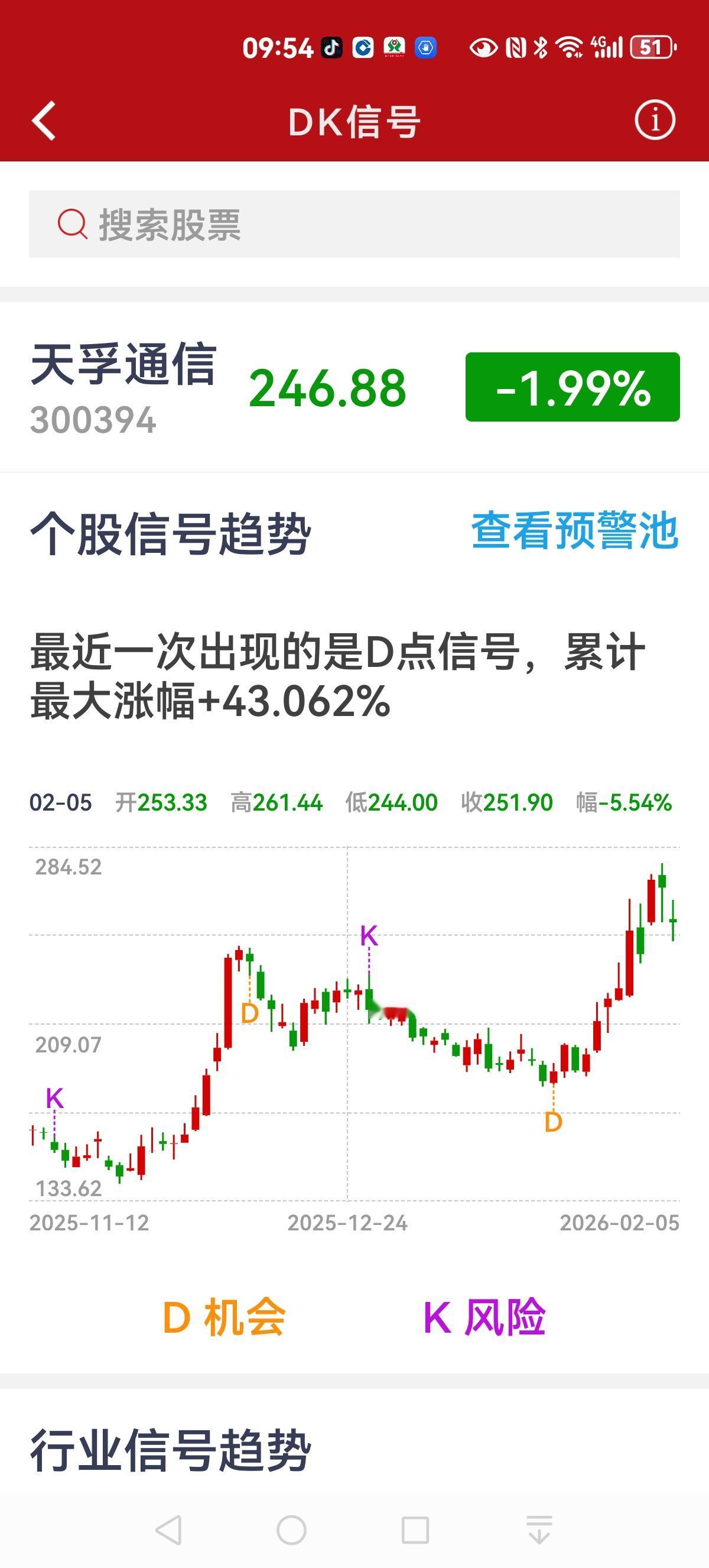 CPO光模块三巨头:急跌直下,机会与迷雾并存 今早中际旭创、新易盛、天孚通信再度杀跌,延续了连日的颓势。有意思的是,在银河软件的DK信号里,这三家至今仍维持着代表机会的D点,并未切换到风险预警的K点。当然,信号终究只是参考,从来不是投资的指南针。我们不妨跳出指标看本质:这三家公司手握硬核技术壁垒,身处高景气赛道,盈利能力强劲,更背靠国内持续加码的算力政策,此番无厘头的下跌,更像是市场情绪的错杀。在喧嚣的交易里,优质标的的价值不会被长期埋没,错杀终会修复,价值也终将回归——看好的尽管坚守,落袋为安或转身离场也都是合理选择,以上内容不构成投资依据。