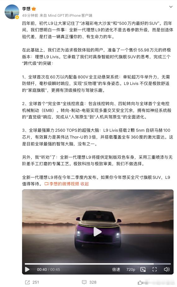 那全新一代理想L9,有哪些亮点?今天李想这条微博,透露了一些内容。