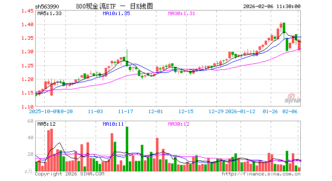 2月6日,截止午间收盘,800现金流ETF(563990)涨0.15%,报1.341元,成交额554.49万元。800现金流ETF(563990)重仓股方面,中国海油截止午盘跌0.18%,上汽集团跌0.14%,格力电器跌0.82%,中远海控跌0.62%,牧原股份跌0.09%,中国铝业涨3.24%,TCL科技跌0.40%,宝钢股份涨0.14%,长城汽车跌0.85%,正泰电器涨0.50%。