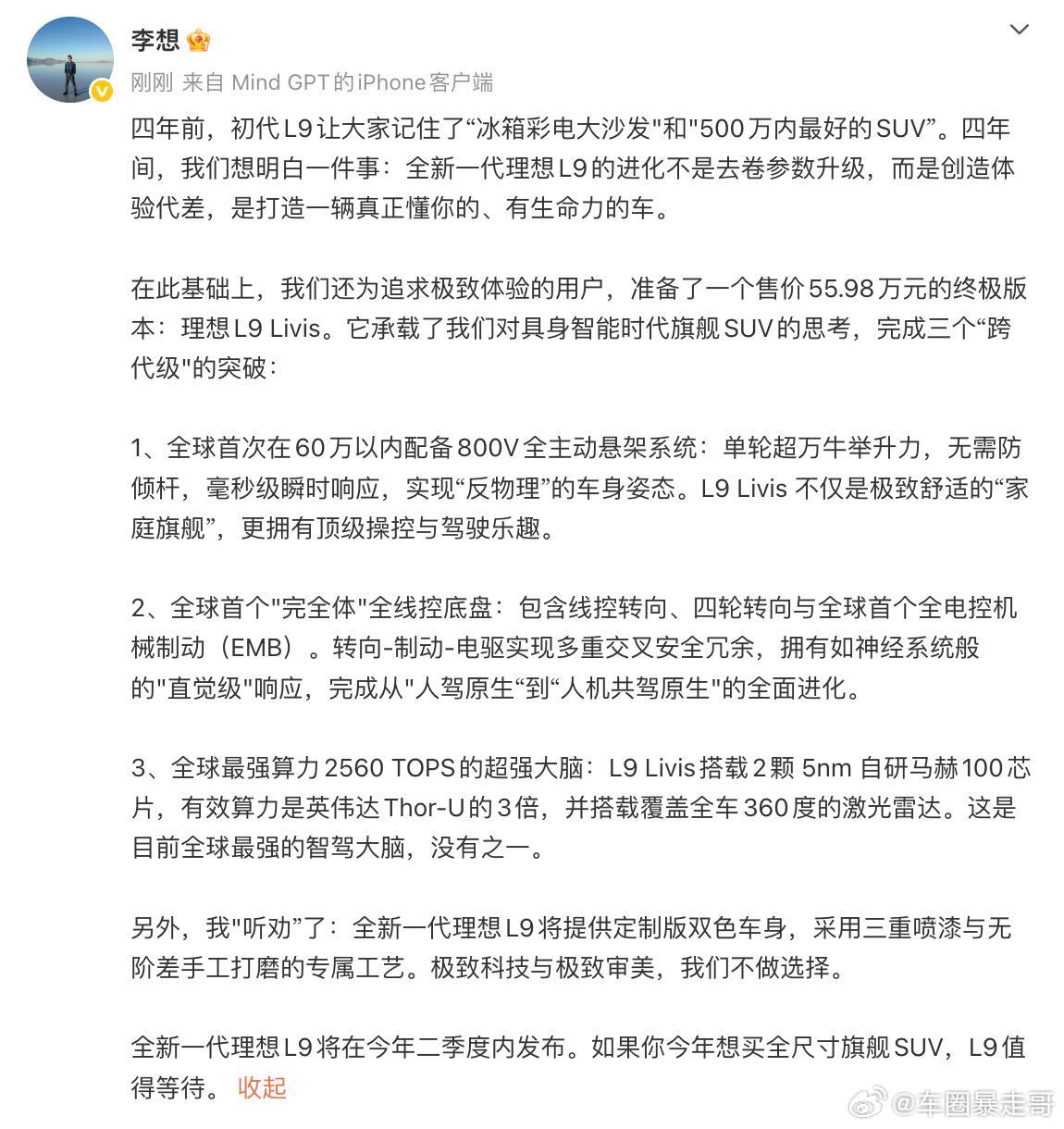 李想对新款理想L9的预告,重点都在最后两段了:“即将到来的全新理想L9,车成为