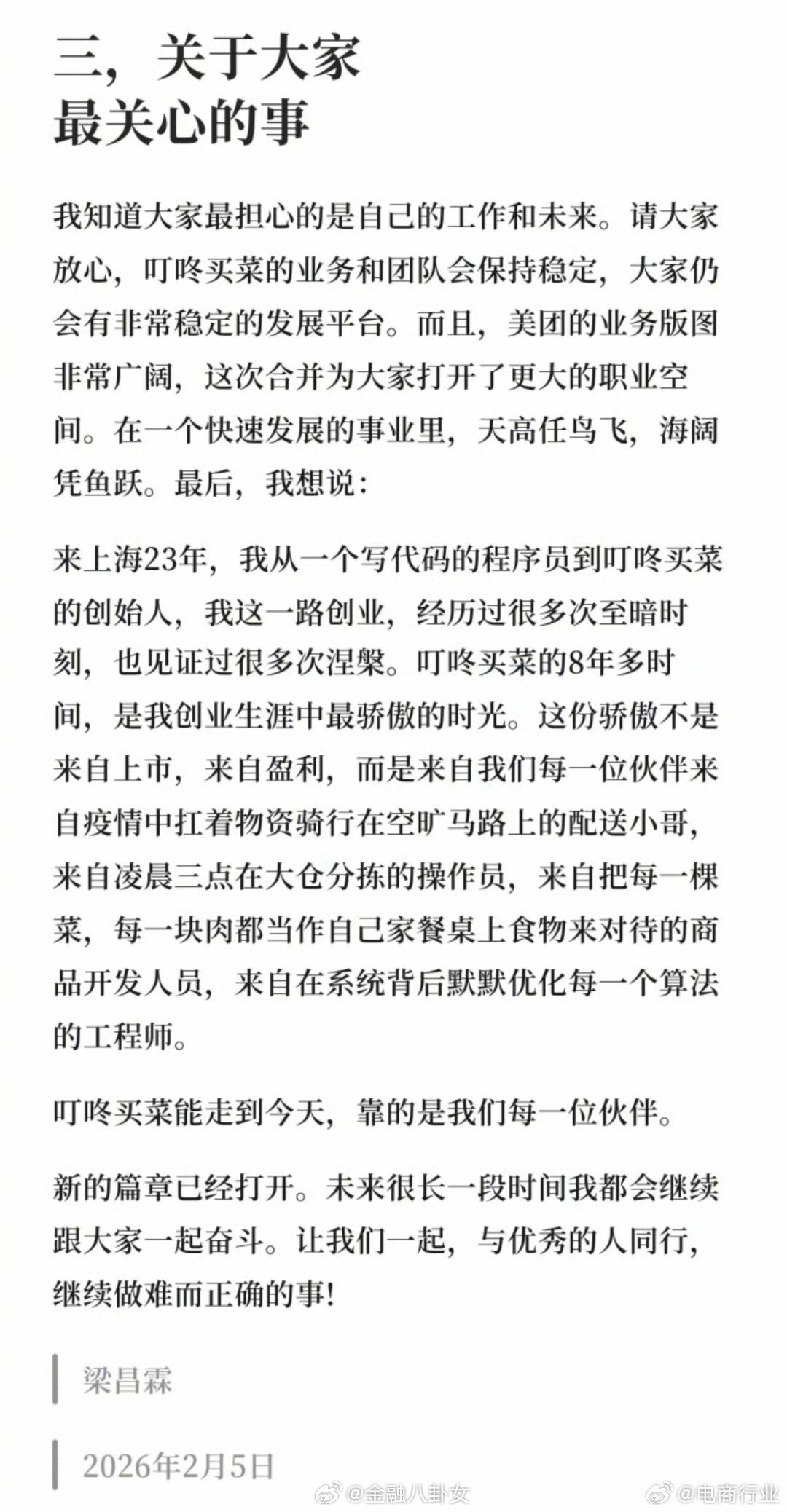 叮咚买菜梁昌霖发布全员信,承诺即使被收购也会保证员工岗位的稳定,选择美团也是经过