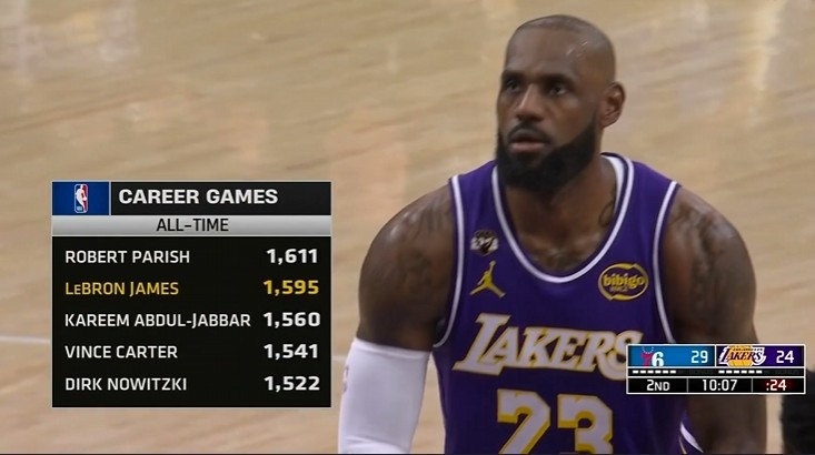 赛中,转播方给出了勒布朗-詹姆斯的一项数据,詹姆斯已出战1595场比赛,距历史第一帕里什还差16场。