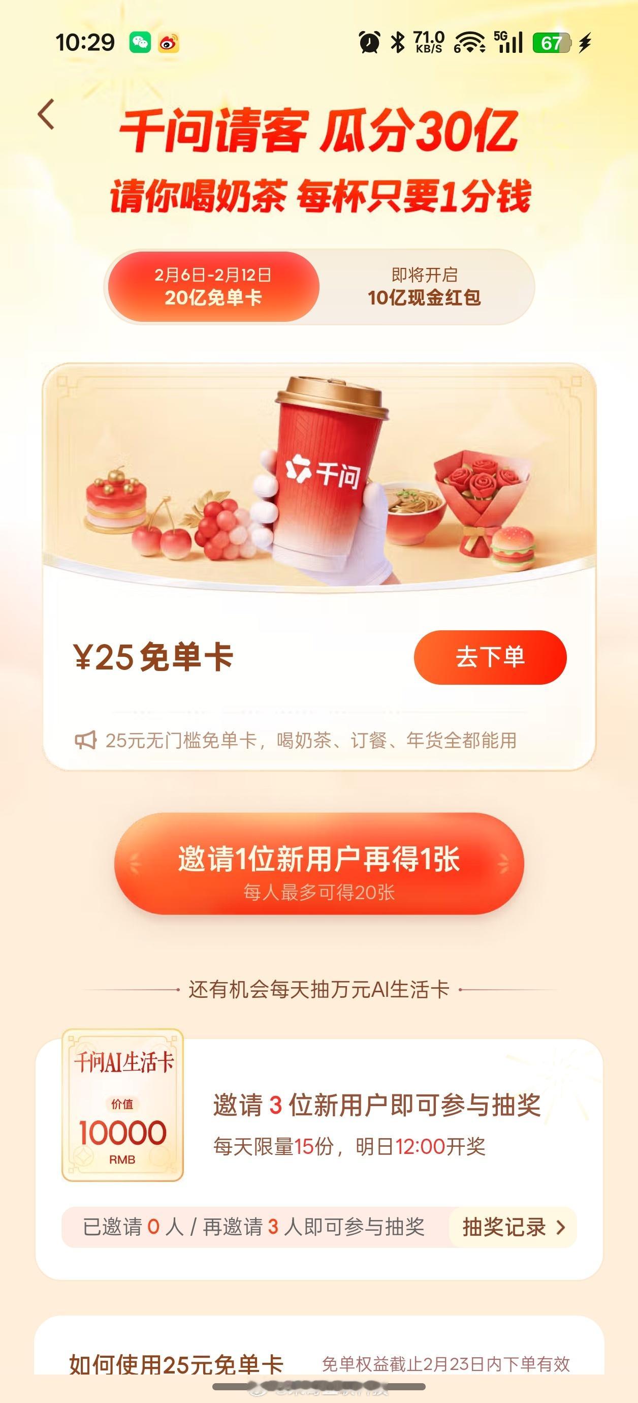 手把手教你薅千问免单奶茶在千问app 输“帮我点杯奶茶”可领25元淘宝闪购通用免单卡就是这个服务器有点不给力啊