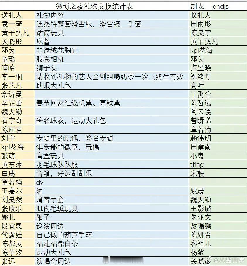 微博之夜交换礼物环节的小表格有的又细心又得体,有的又敷衍又抠门