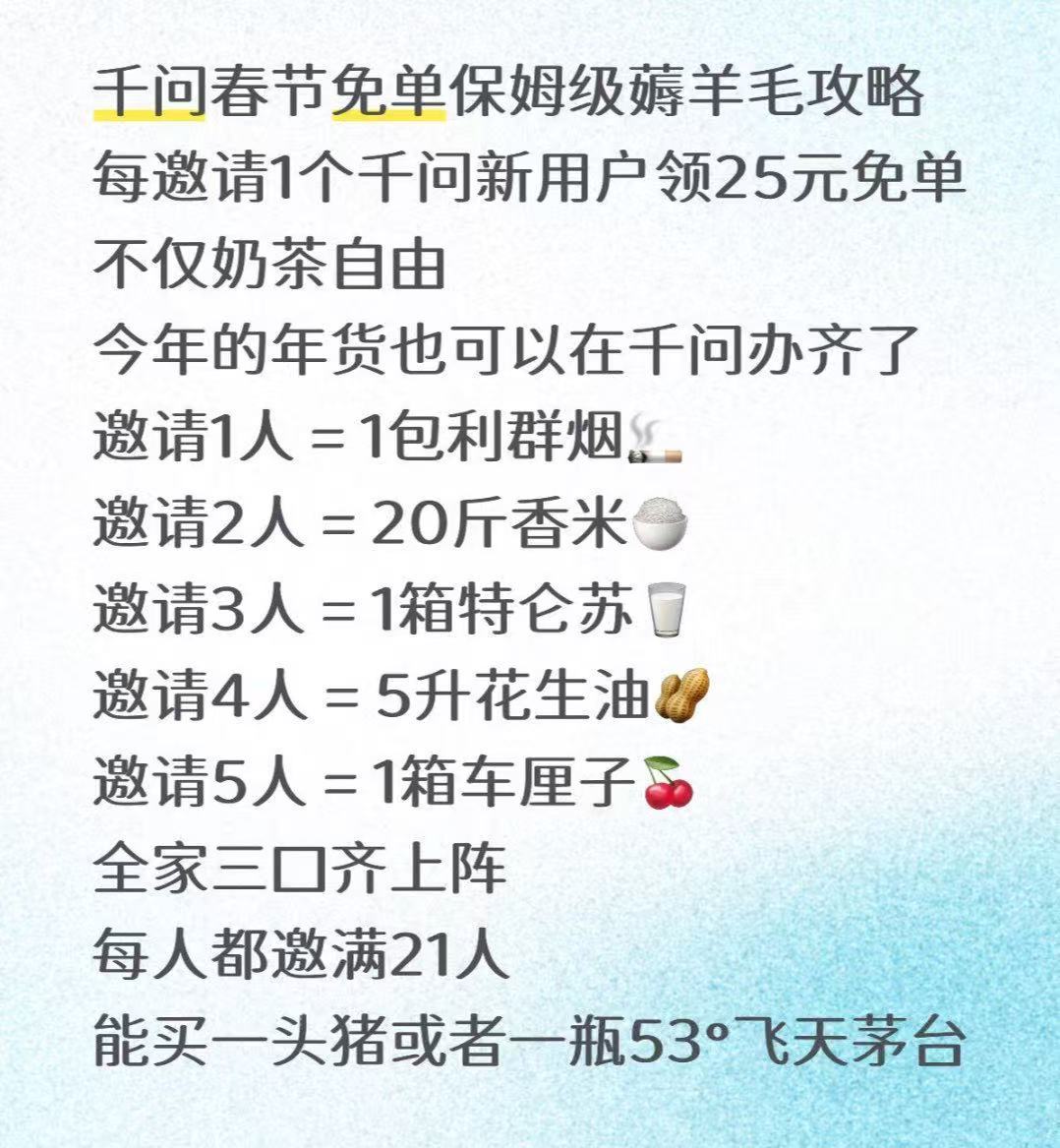 温暖的技术体验应该像老友帮忙:你说“想喝点甜的但别太腻”,他就能领会意思并张罗妥当。千问的春节活动通过免单卡创造了这样的信任起点。即使点得不完美,也没有损失。从12日前的体验到13日后的延续,它用最低的成本让人感受到:把事情交给AI,或许比想象中更靠谱。千问狂砸30亿发起奶茶攻势
