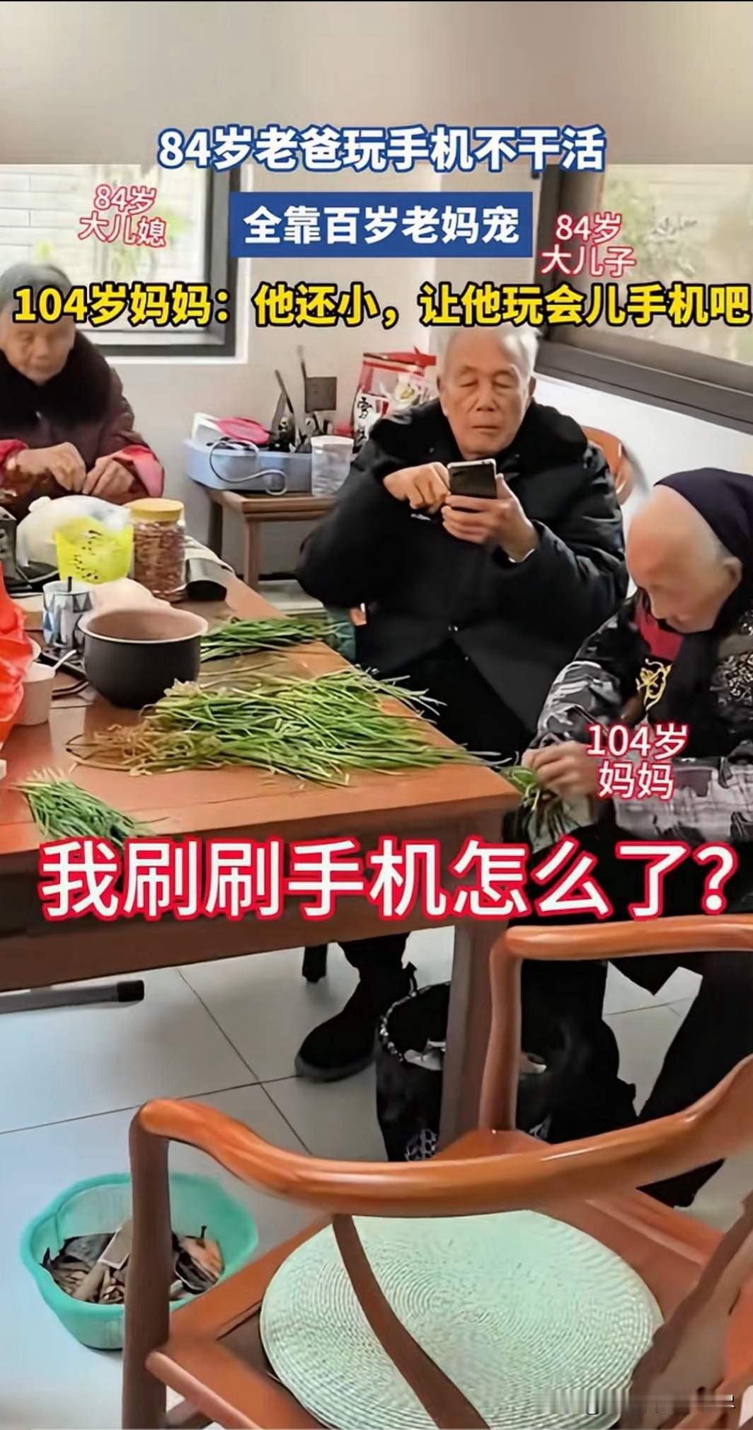 有妈的孩子到底能有多幸福?福建一位84岁的大爷玩手机不干活,全靠有妈的底气,当家人劝这位大爷帮忙干点活的时候,旁边大爷104岁的妈妈却说:“他还小,让他玩会手机吧!”,而当家人说让大爷少玩一会手机的时候,这位84岁的大爷则是一脸骄傲的说“我玩手机,我妈都不管我,你凭啥管我?”,84岁还有妈妈可以喊,还能被妈妈宠爱着,不得不说这位84岁的大爷可真的是太有福分了!