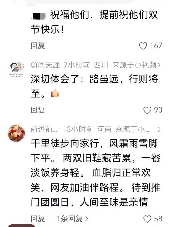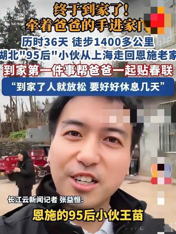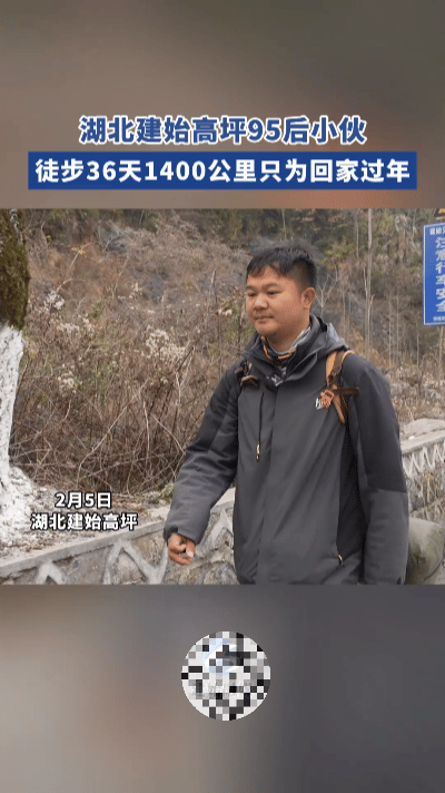 1400公里,徒步47天走回恩施老家…… 从上海出发,沿国道一路向西,皑皑白雪里,一行脚印从东延伸到鄂西。95后小伙穿着磨平后跟的登山靴,背着30斤行囊,一步一步丈量着1400公里的归乡路。 行囊里没有贵重年货,只有给父亲备的厚棉袜,给母亲挑的护手霜,沉甸甸压在肩头。背包带勒进肩膀,留下一圈圈紫红的印子,裤脚常年沾着泥土与草屑,这是他徒步的第47天。 天未亮便跟着导航出发,贴着护栏前行;正午就着山泉水咽干面包,傍晚在桥墩下搭起睡袋。睡前他总会掏出贴身的全家福,看一眼照片里日渐苍老的父母,又攥紧拳头继续赶路。第32天遭遇强降雨,他将背包裹紧雨衣护在胸前,自己浑身湿透,当夜高烧39℃,靠在树桩上熬到天光微亮。 跨越数省,走到村口老槐树发新芽时,那栋熟悉的土坯房终于出现在眼前。父亲蹲在门槛抽烟,望见儿子的刹那,指间的烟头径直砸落在地。父亲伸手摩挲他消瘦的脸颊,触到肩膀的厚茧,转身用袖口悄悄拭去眼角的湿意。 桌上腊肉炖土豆热气升腾,他狼吞虎咽扒着米饭,父亲蹲在灶台边,把他一路磨破的袜子一一摆开,整整齐齐像一列小船。他翻出手机轨迹,弯曲的线条横跨1400公里,终点直直指向家的方向。 那双旧登山靴被母亲收进木箱,叮嘱来年一定要坐车归乡。鞋跟磨平的痕迹里,藏着一路风霜,也装着满心牵挂。 你为了回家,曾拼尽全力做过哪些事?那些奔赴团圆的时刻,哪一幕最让你难忘? 徒步47天跨越1400公里 国道上的归乡脚印 最执着的回家路 春运里的平凡坚守
