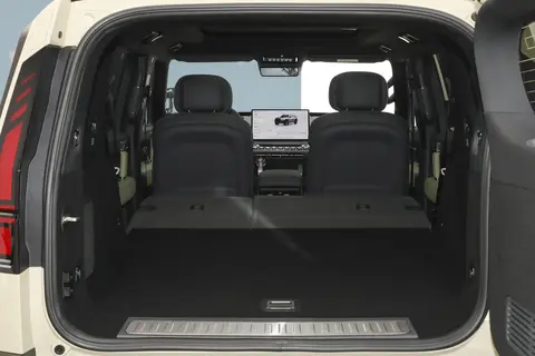 车身侧面采用双段式腰线,搭配外凸的大尺寸轮包,如同雄狮蓄势待发的姿态,A 柱倾角优化至 50°,有效降低风阻与风噪;无边框外后视镜取消传统镜框,镜面与车身过渡自然,兼具美观与实用,支持电动调节、加热、折叠及倒车自动下翻功能。车尾剑指苍穹 2.0 超红 LED 尾灯,由 298 颗超红 LED 与 24 万余激光精细皮纹组成,点亮时呈现出鞘利剑般的光幕效果,辨识度拉满。该车提供秦岭绿、玉龙银等六种外观颜色,其中秦岭绿车漆呈现流动金属光泽,明暗交替间尽显野性与生命力,契合越野车型的气质。
