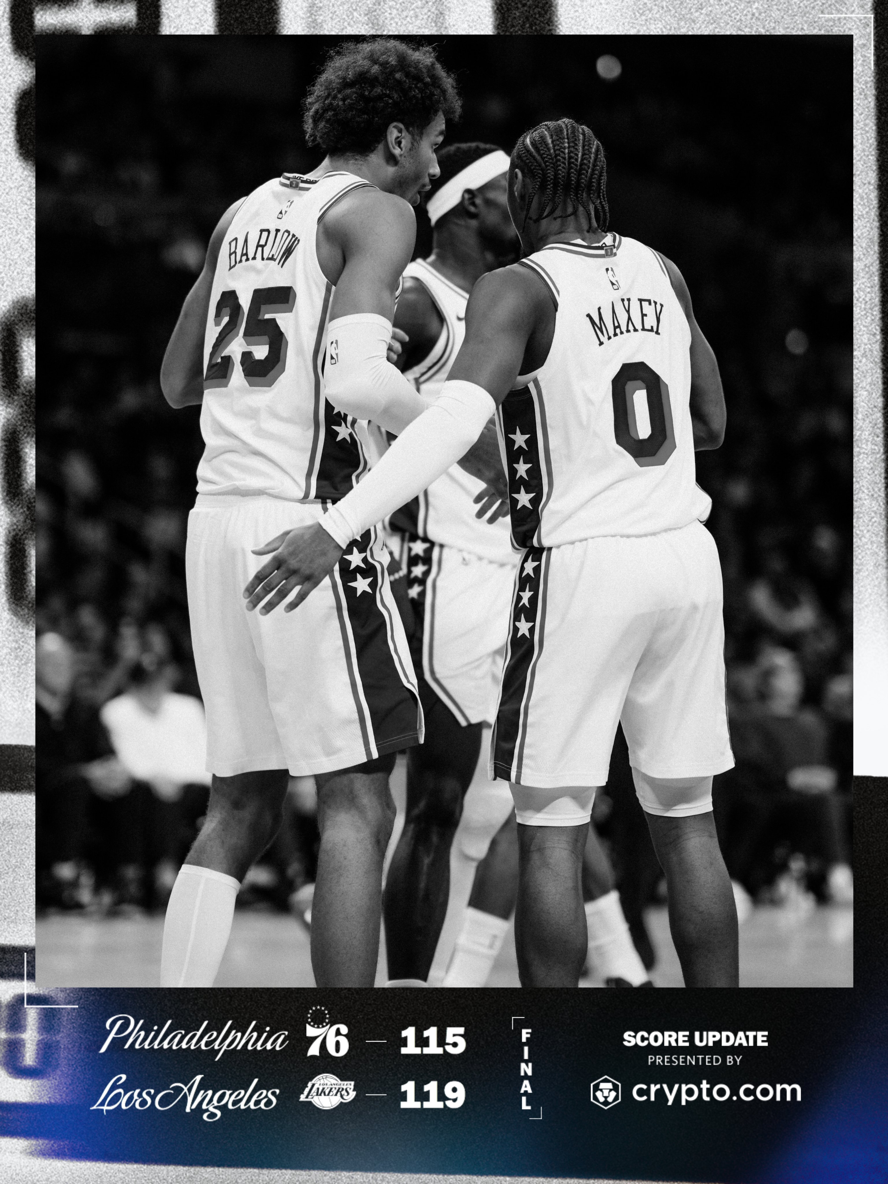 末节崩盘!全场比赛结束:76人队客场115-119不敌湖人队,球队五连胜遭终结!恩比德35分7篮板7助攻2封盖,马克西26分13助攻4抢断,埃奇库姆19分10篮板4抢断,巴洛13分2抢断,乌布雷8分4篮板3抢断!