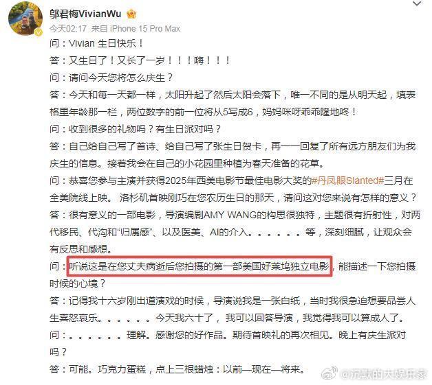 今年的60岁生日没有盛大派对,邬君梅选择为自己写诗、亲手制作贺卡,在自家小花园栽种春花幼苗,逐一回复每一位友人的祝福,蛋糕上仅插着三根蜡烛,象征着“过去-现在-未来”。邬君梅透露丈夫已病逝
