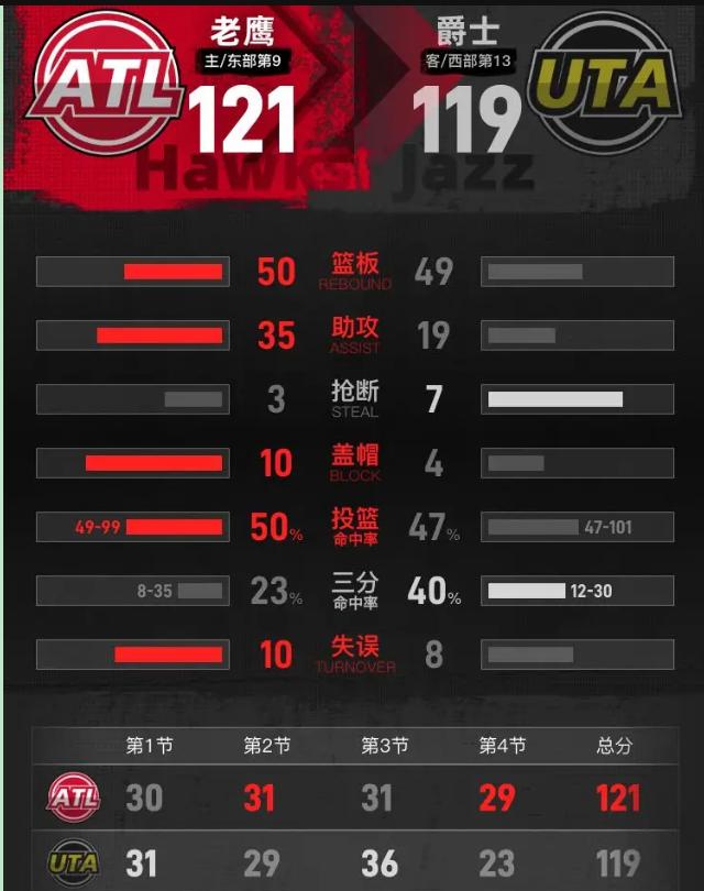 别看数据炸裂,这场球压根不是天才盛宴,纯粹是“菜鸡互啄”的典型! 看老鹰险胜爵士那场了没?121-119,比分紧咬,数据也唬人:杰伦-约翰逊大三双,新秀科利尔也爆了。但说真的,这比赛看得我直乐——两边简直在比谁更下饭!老鹰那防守,开场跟清晨的马路似的,让爵士新秀随便抡。领先十来分在这俩队身上根本不算事,战术素养?不存在的,就是互爆局! 最搞的是第四节,简直就是失误集锦。你运球出界,我传球砸脚,分差死活拉不开。但赢就赢在,最后两分钟约翰逊真敢传,几个冒险分球愣是找到了空位。反过来看爵士,科利尔数据漂亮,关键时刻却上头硬冲,眼里只有篮筐;马尔卡宁更是隐形,最后一攻要位都费劲。说白了,爵士不是输给对手,是输给自己断电! 说点大实话:这种比赛热闹是真热闹,年轻人敢打敢拼,数据也好看,周末图一乐挺好。但你要当真以为这是“未来已来”,那就天真了。老鹰这防守进附加赛都悬;爵士天赋一堆,却不懂怎么赢球。数据会骗人,胜利可不会! 所以啊,球迷看个开心就好,但也得清醒:季后赛级别的较量?这两队还差得远呢。成长路上总要交学费,今晚,只是学费交得比较响罢了。杰伦约翰逊22+16+15兰代尔26+11 老鹰胜爵士