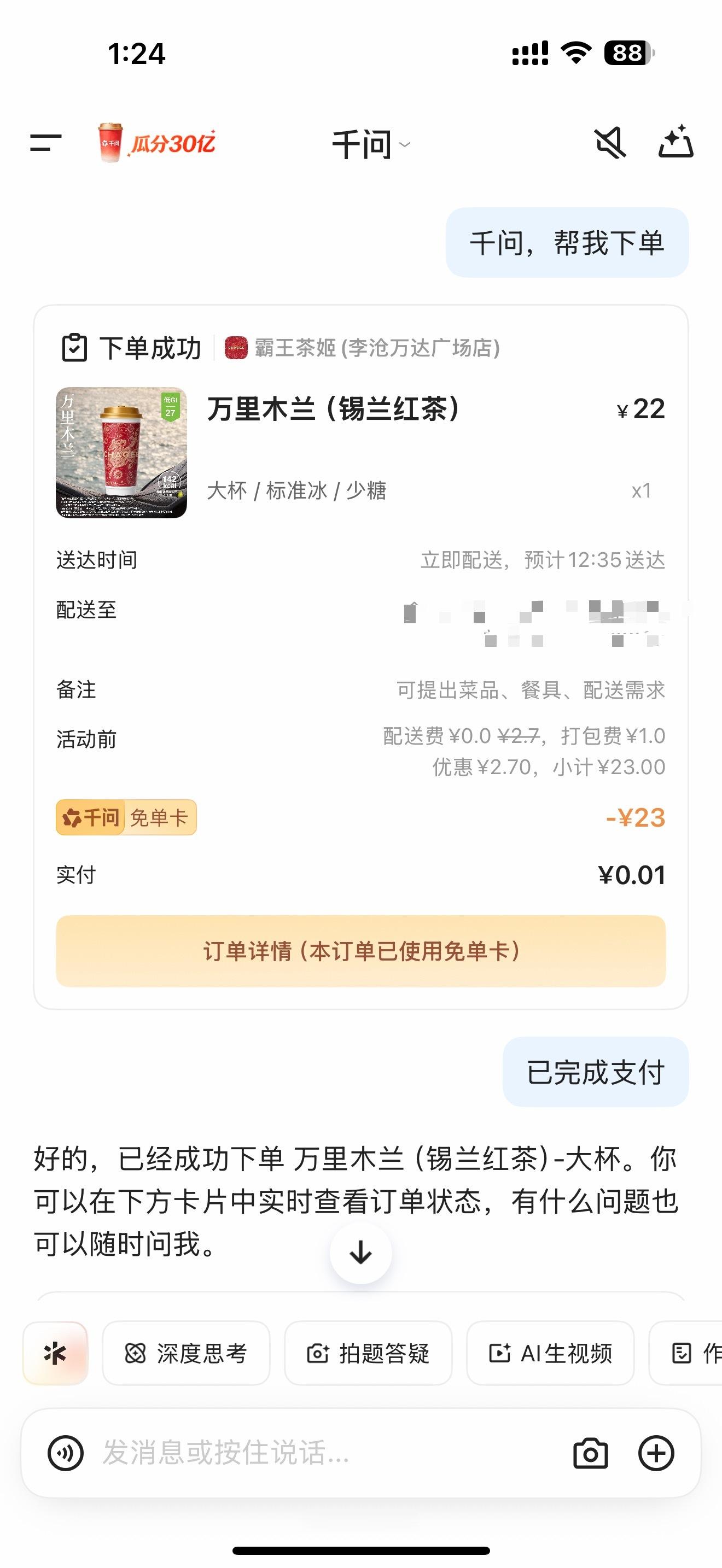千问提醒网友分散下单奶茶喝上了,等了好久。一句话就可以直接连接闪购下单,把原本被一堆 App 切碎的生活流程重新连起来了。如果以后很多日常事真的只需要一个对话框实用性的话还有待考量,大家喝到奶茶了么?