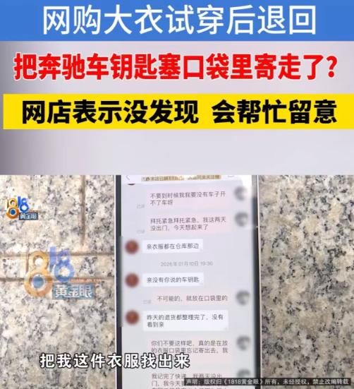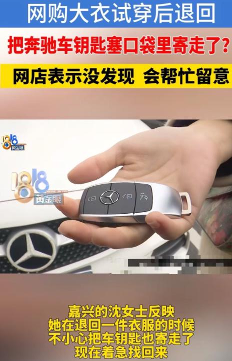 嘉兴,女子网购退衣服时,不慎将奔驰车钥匙放在口袋里一起寄走了,重新配一把需要6000多块钱,她希望商家帮她走回来!商家:没看到车钥匙,退回的衣服又卖出去给别的顾客了!网友:试穿衣服我们把车钥匙放口袋里?不合适就直接退啊! 说白了,这就是一场因粗心引发的网购退货罗生门,一边是丢了奔驰钥匙要花6000多块重配的嘉兴女子,一边是说没看到钥匙还把退货衣服转卖的商家,两边各执一词,网友们吵得更是不可开交,热闹得不行。 事情发生在嘉兴,一位女子在网上买了件衣服,退回去的时候,居然把自己的奔驰车钥匙落在衣服口袋里,一起寄给商家了。 等她发现钥匙不见了,回忆半天才反应过来,大概率是跟着退货包裹走了,急得不行,赶紧联系商家,希望对方能帮忙找一找,把钥匙寄回来。 毕竟据说重新配一把奔驰车钥匙,得花6000多块钱,这可不是一笔小数目,换谁丢了都得心疼。 可商家那边的回应,直接给女子泼了一盆冷水,说收到退货后,压根没看到什么车钥匙,而且更关键的是,她退回的那件衣服,检查完觉得不影响二次销售,已经重新打包卖给别的顾客了,现在想找都没法找。 女子一听就更急了,自己明明记得钥匙放在口袋里,怎么就没了,商家怎么会没看到。 这事一传到网上,立马就炸了锅,网友们的评论五花八门,最集中的一个疑问就是,试穿衣服而已,不合适就赶紧脱下来打包退货,干嘛还把车钥匙放进口袋里? 这话其实也有道理,正常情况下,谁试新衣服会顺手把车钥匙塞人家衣服口袋里啊,难免让人猜测,她是不是根本不是试穿,而是把衣服穿了好几天,去参加什么聚会、应酬,装完场面之后,觉得衣服没用了才想起退货,钥匙就是穿的时候不小心放进去,然后忘了拿出来的。 也有网友站在女子这边,觉得商家这边可能有问题,毕竟一般来说,客户退货,商家收到包裹后,肯定要仔细检查一番,看看衣服有没有刮坏、蹭上灰尘,拉锁、扣子是不是完好无损,有没有被洗过,吊牌还在不在,能不能二次销售。 要是口袋里真有奔驰车钥匙这么个显眼的东西,按道理来说,肯定能检查出来,商家一口咬定没看到,不承认的目的,估计也只有他们自己心里清楚,说不定是看到钥匙故意藏起来,也有可能是真的疏忽,但谁也说不准。 不过也有网友替商家说话,说做电商退货的都知道,每天要处理上百件甚至几百件退货,工作量特别大,检查的时候,重点都是看吊牌完不完好、衣服有没有污渍、纽扣拉链坏没坏,确保能二次销售就行,一般不会特意去翻衣服口袋,要不然工作进度得被拖慢一大截,根本忙不过来。 再说了,你自己买的衣服不满意要退货,还把车钥匙放人家衣服口袋里,本身就不合常理,这事说到底,还是女子自己太粗心了。 我还看到有网友说,据说女子退的那件衣服,寄回去的时候比收到时重了几百克,她觉得那就是钥匙的重量,还调了小区监控,显示自己确实把钥匙放进了衣服口袋,但商家那边说仓库没装监控,没法证明自己开箱时没看到钥匙,两边各有说法,又都没有十足的证据。 而且据说奔驰车钥匙配起来不仅贵,还特别麻烦,有的甚至要等大半个月才能拿到,这就让女子更着急了。 其实这事没有绝对的对错,各方都有自己的说法和难处,以上全是我个人看法,不代表任何立场,也不评价任何人。 大家觉得这事到底是谁的问题?是女子太粗心,还是商家检查不到位?欢迎在评论区说说你们的看法。
