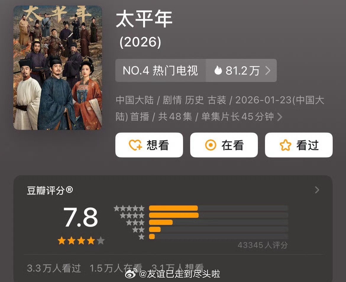 最近几部新剧豆瓣开分,高了还是低了?赵丽颖、黄晓明《小城大事》开分7.1,10.4w打分白宇、周雨彤《太平年》开分7.8,4.8w打分魏大勋、孙千《有罪之身》开分6.8 ,2.3w打分