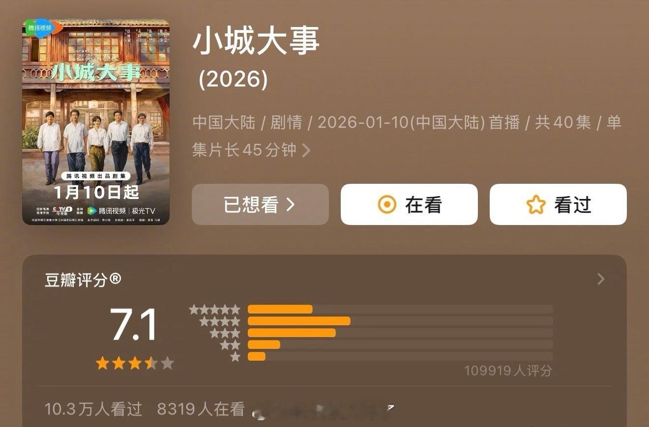 近期剧集开分一览:赵丽颖、黄晓明《小城大事》7.1分白宇、周雨彤《太平年》7.8分分值正常吗?