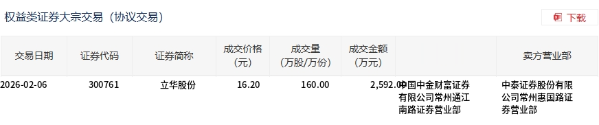 2月6日,立华股份大宗交易成交160万股,成交额2592万元,占当日总成交额的11.66%,成交价16.2元,较市场收盘价20.18元折价19.72%。