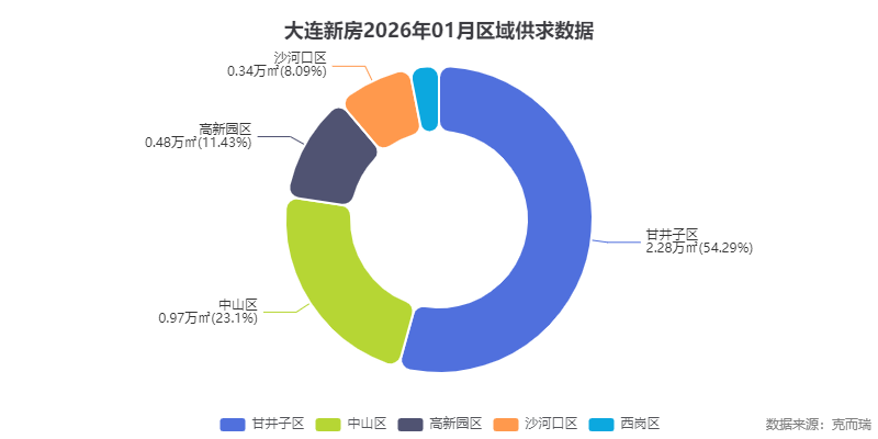 克而瑞数据显示,2026年1月甘井子区新房成交面积达2.28万㎡,占全市总量54.4%,远超其他四区之和。这表明在市场整体低迷背景下,性价比更高的近郊区域正成为改善需求的主要承接地。