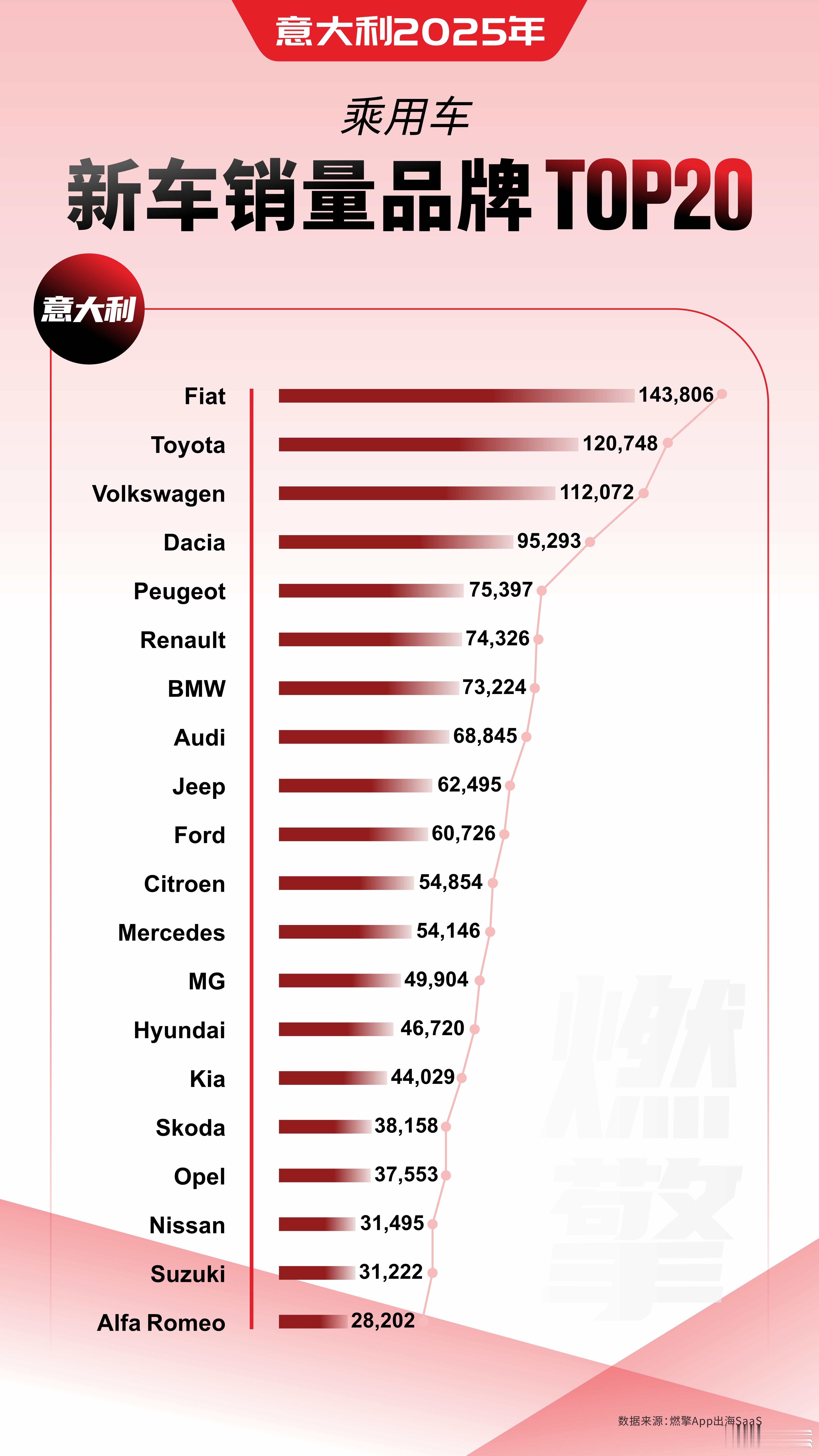菲亚特以143806辆的销量遥遥领先,毫无悬念地稳坐市场头把交椅。作为意大利的“国民品牌”,其产品线深度契合当地消费者偏好,尤其是灵活的小型车与实用家轿,在城市通勤场景中占据绝对优势,深厚的品牌情感与完善的渠道网络构成了其难以撼动的市场地位。阿尔法·罗密欧也进入前二十,在运动化细分市场占据一席之地。