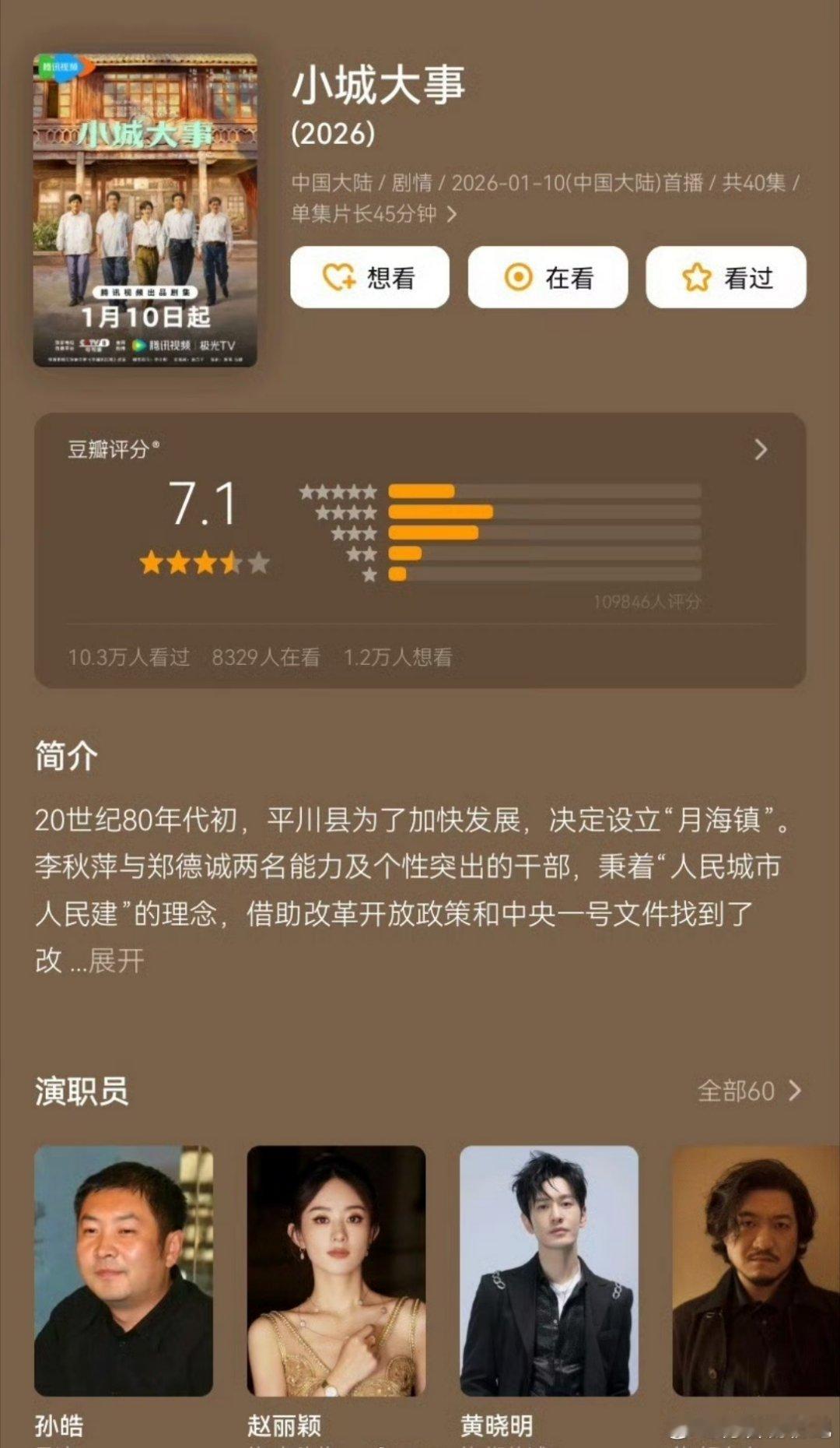 赵丽颖、黄晓明《小城大事》开分7.1魏大勋、孙千《有罪之身》开分6.8 白宇、周雨彤《太平年》开分7.8