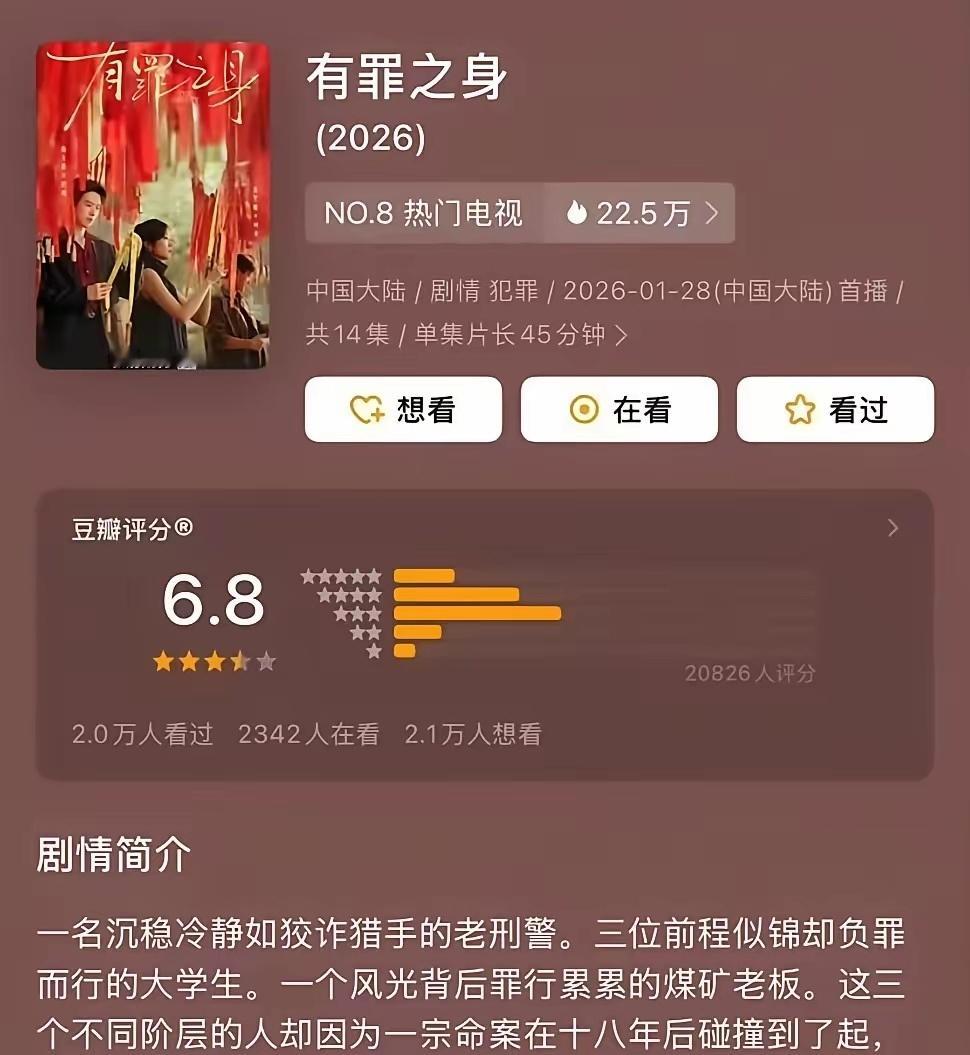 魏大勋的《有罪之身》开分6.8分,数据一般,口碑也没保住。