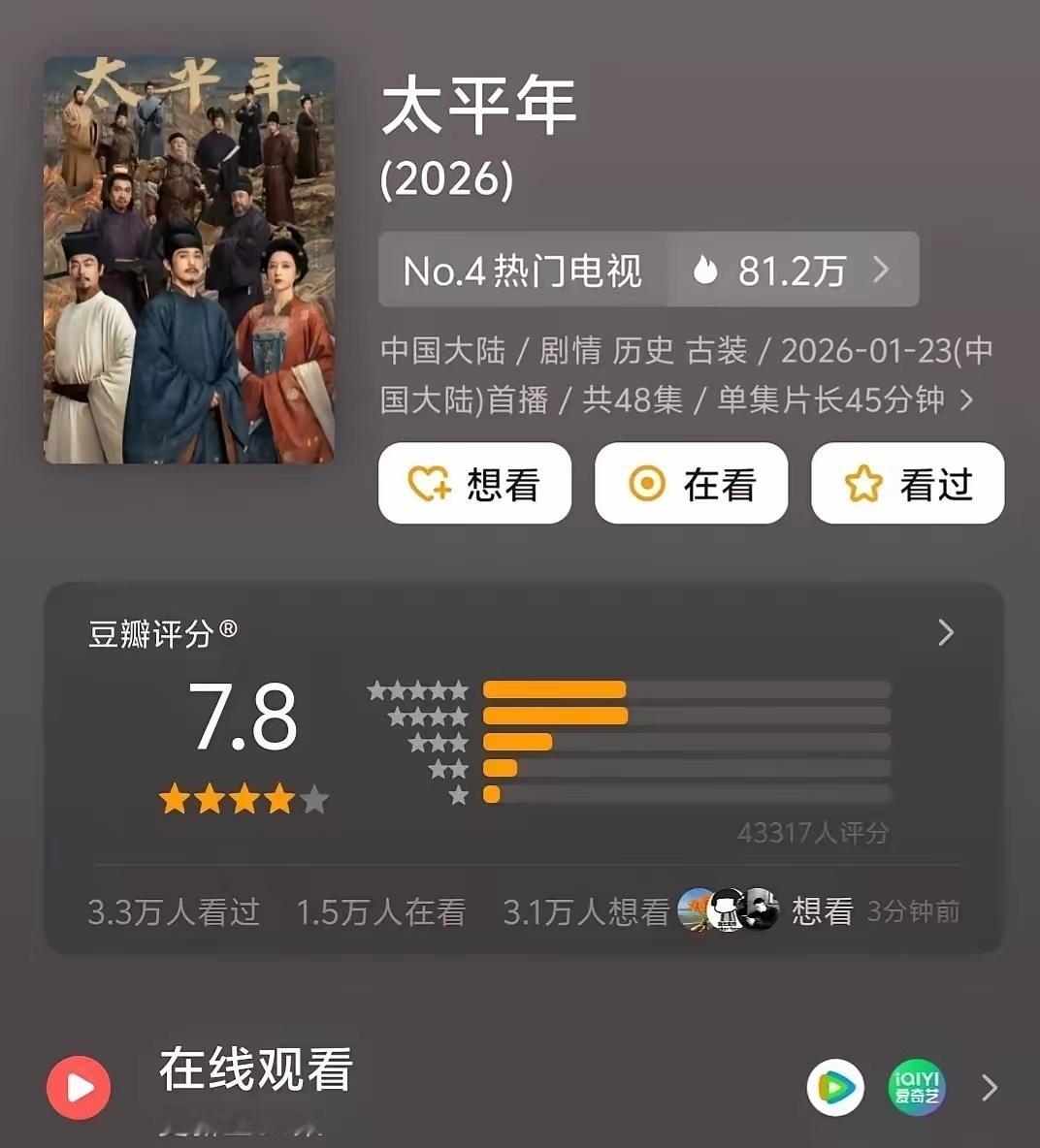 《太平年》总共有4万人评分,四星五星的评价基本持平,看得出来观众对这部剧很满意。
