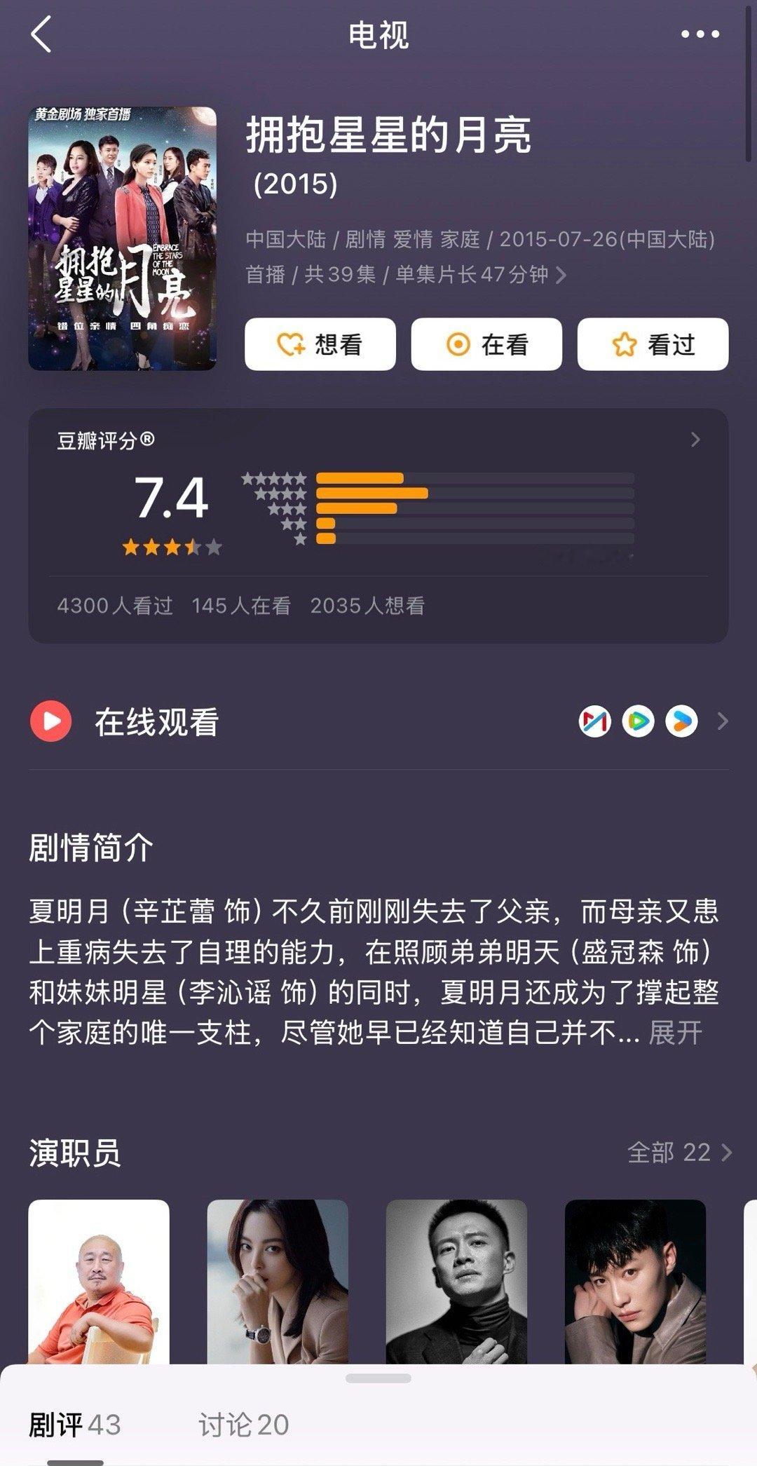 辛芷蕾新剧豆瓣开分7.5 辛芷蕾的选剧眼光和扛剧能力真的稳!从《拥抱星星的月亮》到《女神蒙上眼》,四部一番作品豆瓣均分稳居7分以上,既有收视冠军的“声量”,又有口碑不俗的“质量”,这种持续的高品质输出,才是演员真正的底气。