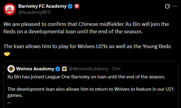 巴恩斯利官方:徐彬租借加盟半赛季,可同时代表两队U21出战