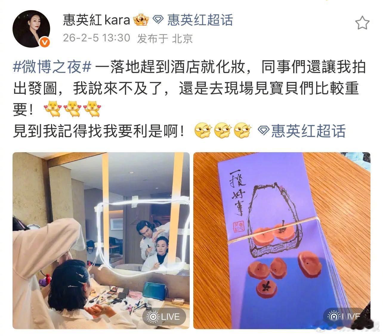 惠英红微博之夜的散财童子不懂就问,红姐这么好的姐姐去哪里找!今年微博之夜红姐特意带了一沓红包来现场,给现场的艺人和工作人员分发,陈伟霆、谢霆锋、容祖儿、杨幂、舒淇、黄渤、汪苏泷、周深、倪妮、李一桐、刘雨昕都拿到了红姐的红包,上面画的“一揽好事”听说还是姐姐亲自画的,超用心!