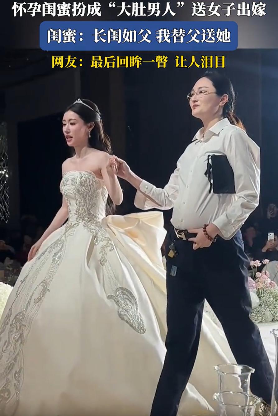 这闺蜜能处!湖南,女生要结婚了,但让她难受的是,父亲去世看不到这一幕,也没办法送她出嫁,闺蜜得知后,婚礼当天代替女生的父亲送她出嫁,而怀孕的肚子刚好扮成“大肚男人”,替父送嫁的样子真的又暖又戳泪 婚礼那天,闺蜜悄悄扮上了。一件白衬衫扎进西裤,衬衫下塞出圆鼓鼓的“将军肚”,手腕上套着佛珠手串,手里还拎了个公文包,活脱脱一个长辈的样子。她没提前张扬,直到新娘该出场时,才最先走出来,自然地站到新娘身边 那一刻,新娘明白了。这个从小一起长大的朋友,正代替父亲,陪她走完出嫁前的最后一段路。闺蜜挽着她,一步步走得很稳,就像真的长辈那样,郑重地把她的手交到新郎手里 任务完成后,闺蜜转身退场。可走着走着,她脸上还挂着笑,眼泪却掉了下来,回眸的一刻,有替朋友高兴,有对叔叔的怀念,也有完成一件重要事情后的如释重负 婚礼现场很多人都看懂了,悄悄抹眼泪。视频传到网上,大家也被这份情谊打动:这才是真闺蜜,关键时候顶得上 其实我们身边都有这样的朋友,平时可能互损,偶尔还闹别扭,但真遇到事儿了,她比谁都着急。她知道你心里最软的那块地方,会在你最需要的时候,用她的方式给你补上 如今大家都忙,联系也少了,但真朋友其实不需要天天见面。就像这场婚礼上的闺蜜,她可能不会说漂亮话,却在你人生的重要关口,默默站到了那个最该站的位置。这种友情,经得起时间,也扛得住事儿