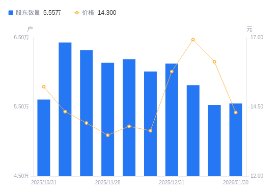 日期A股户数(户)流通A股户均持股数(股)户均持股市值(万元)2026-01-305550523879.0534.152026-01-205529523969.7338.662026-01-095815122792.5038.592025-12-316127321631.1734.132025-12-196011722047.1230.072025-12-106189721413.1029.552025-11-286138621591.3529.112025-11-206321320967.3129.192025-11-106429520614.4629.542025-10-315605923643.0636.01